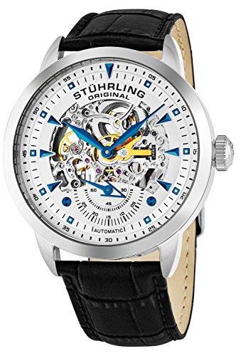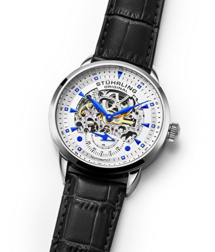 Round watch with silver skeleton dial featuring blue markers and small seconds subdial at 6 o'clock