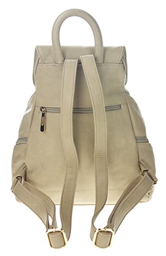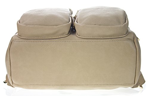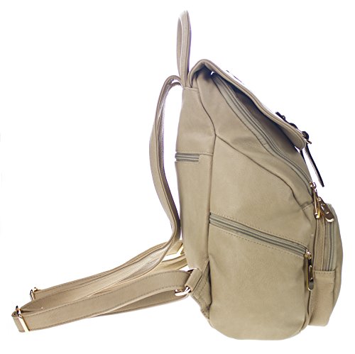 DESIGN: durable soft PVC daypack; 2 front zipper pockets; 2 side zipper pockets; 1 back zipper pocket; magnetic clasp flap-top cover, zipper around closure at roomy main compartment: 1 inner zipper pocket.