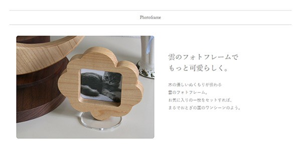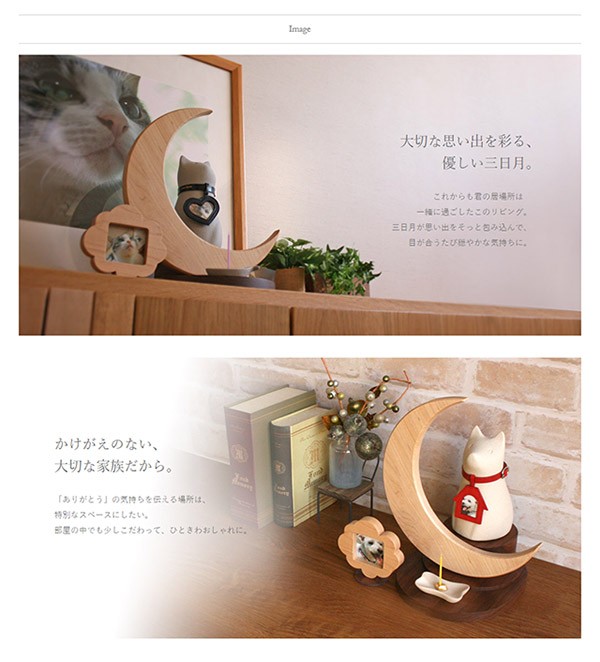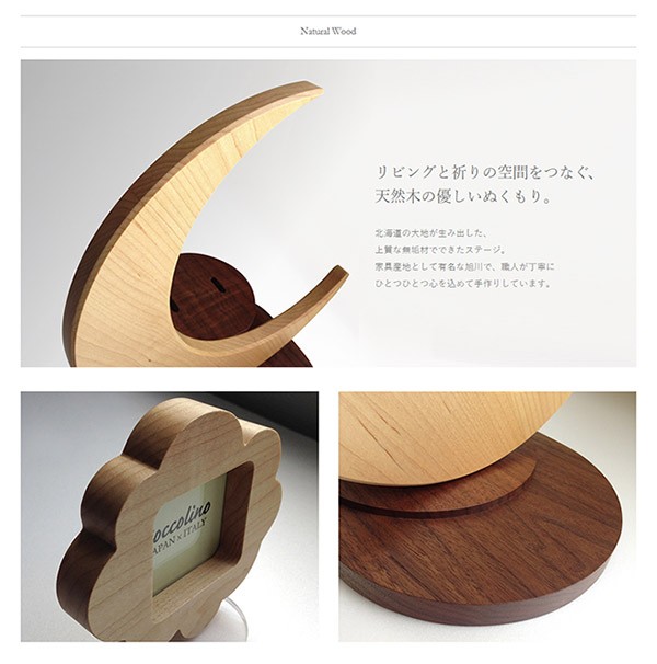美しい弧を描く月が印象的な、無垢材のステージです。ひとつひとつ職人による手作りで、木のぬくもりが骨つぼモニュメントを包み込みます。可愛らしい雲のフォトフレームと協演して、まるでおとぎの国のワンシーンのよう。