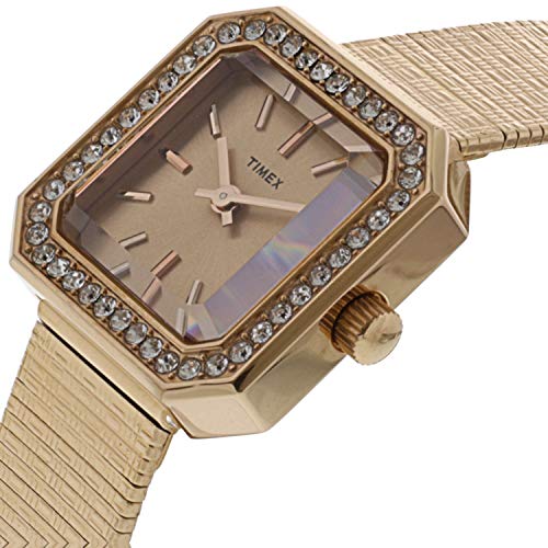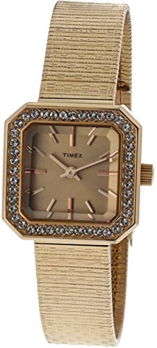 Brand, Seller, or Collection Name:Timex Model number:T2P551 Part Number:T2P551 Item Shape:Square Dial window material type:Mineral Display Type:Analog Clasp:Fold-over-clasp Case material:Stainless steel Case diameter:25 millimeters Case Thickness:9 millimeters Band Material:Metal Band length:Women's Standard Band width:14 millimeters Band Color:Rose-Gold Dial color:Rose-Gold Movement:Japanese quartz Water resistant depth:30 Meters