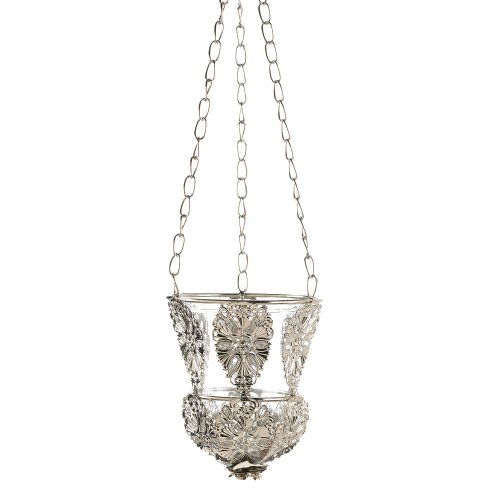 Studio : hyrekos Publisher : hyrekos Binding : Misc. Product Description Create an elegant ambiance instantly when you place a candle inside this gorgeous and ornate hanging holder. Delicate silver filigree ornaments grace a beautiful glass candle cup that's rimmed with silver and hangs from three chains.