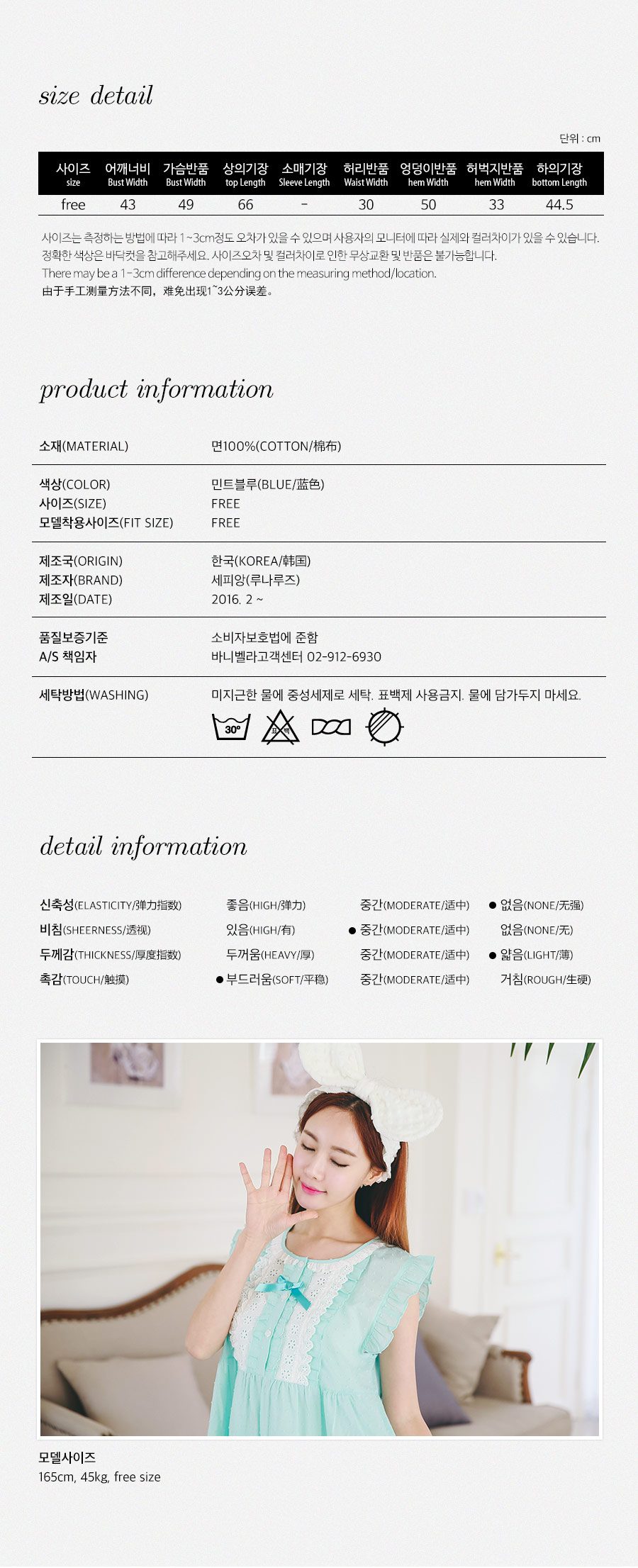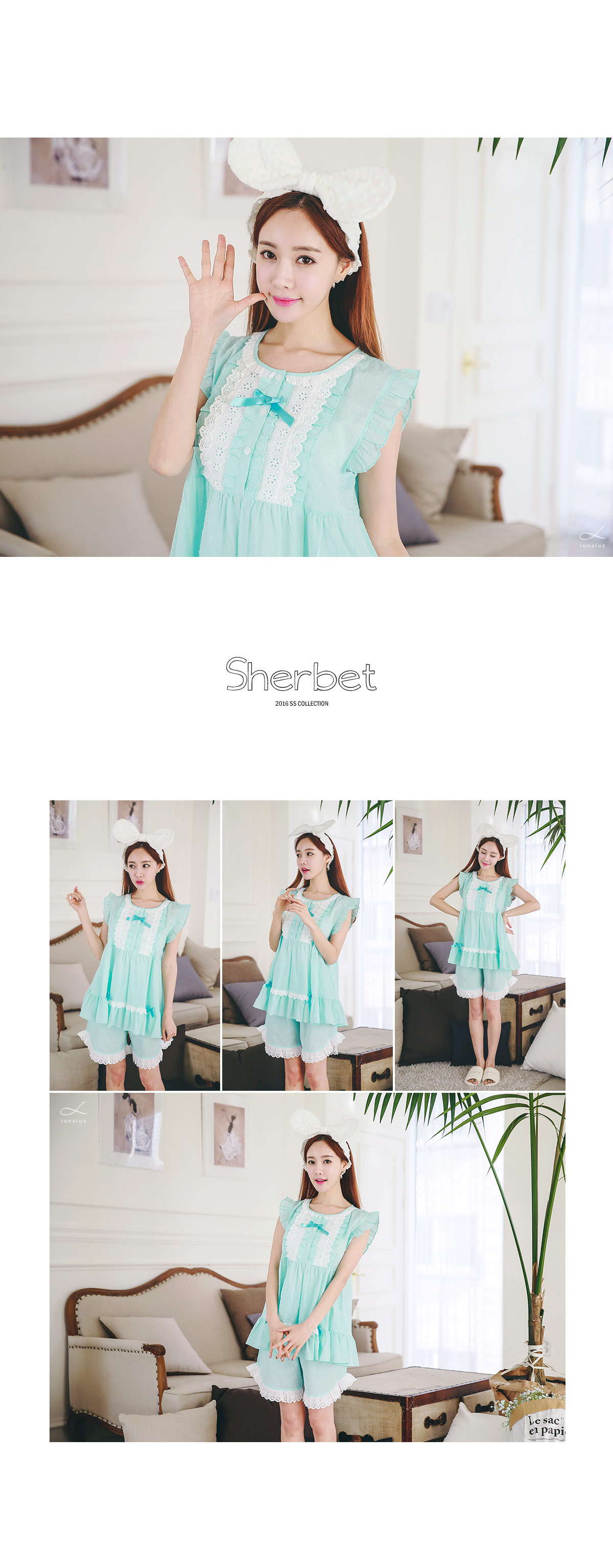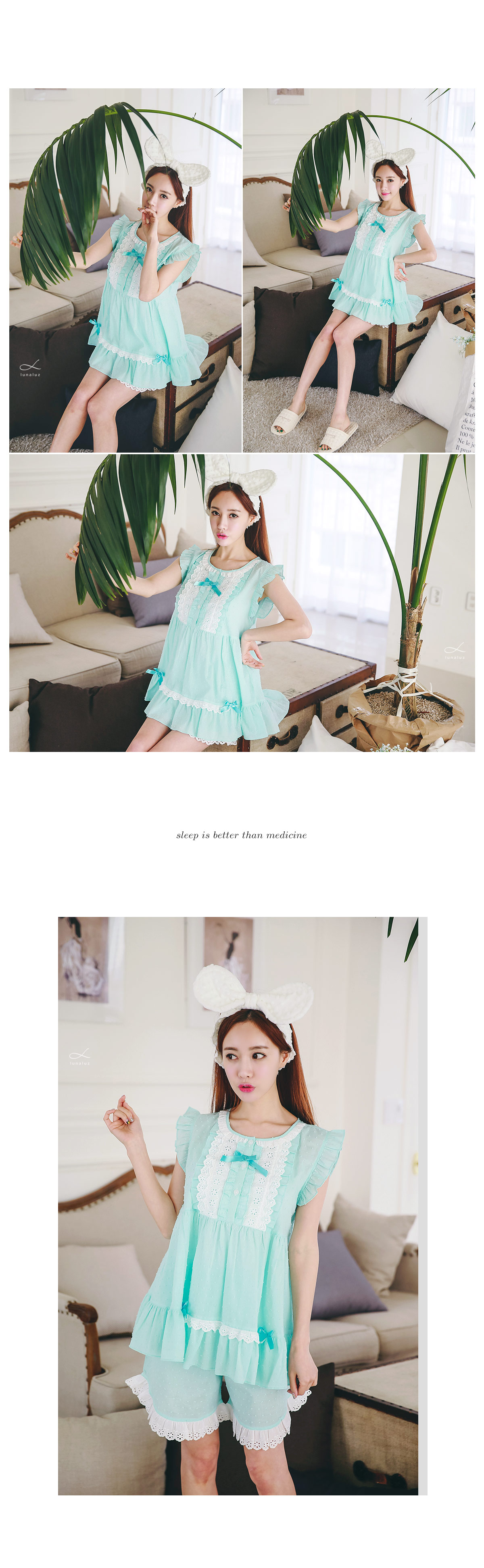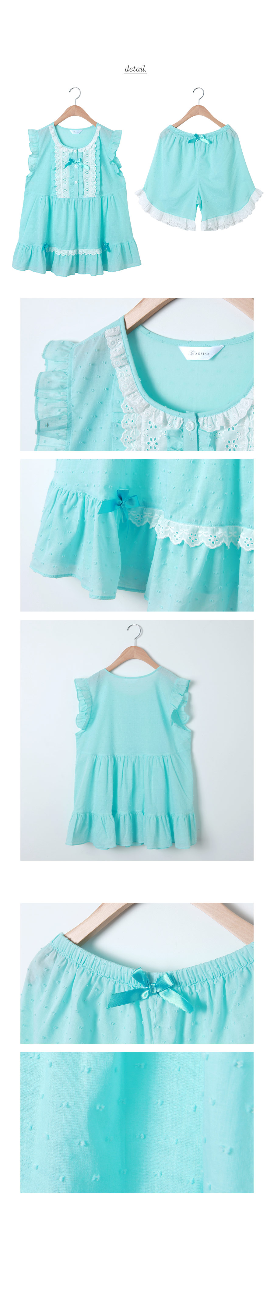 보기만해도 정말 정말 시원한 느낌의 민트에요 >.< ! 일반 순면 원단이 아닌 포인트가 있는 우라기리 원단을 사용하여 제작하였어요~ 그래서 시원하면서 고급스러운 느낌이 드는데요~ 품이 낙낙해서 66size까지도 무난하게 착용하실 수 있어요~ 바스트 부분을 여러겹으로 덧댄 아이보리 컬러의 레이스 장식과 촤르르 내려오는 핏이 정말 귀여워요~ 하단에 레이스 장식을 달아주어 포인트를 주었고요. 팬츠는 양 사이드의 길이를 확 짧게 잡아주어 다리 라인을 좀 더 슬림하고 길어보이는 효과를 준답니다.~ 전체적으로 러블리하면서 귀여워보여 특별한 날에 입기에도 최고인 잠옷이에요 : ) 상큼한 컬러와 발랄한 분위기의 디자인이 어우러져 분위기를 한 층 더 UP 해준답니다^^