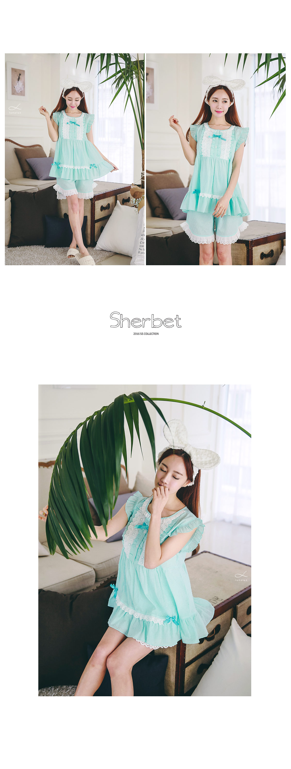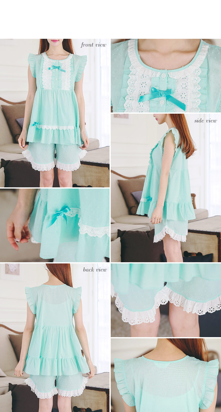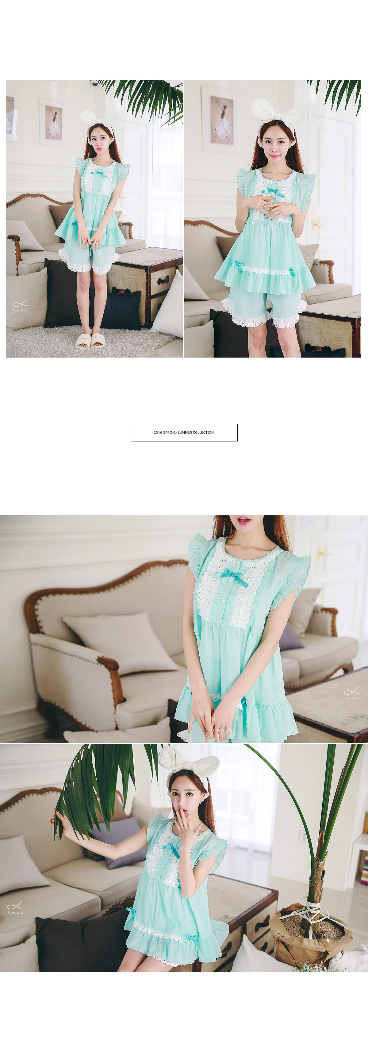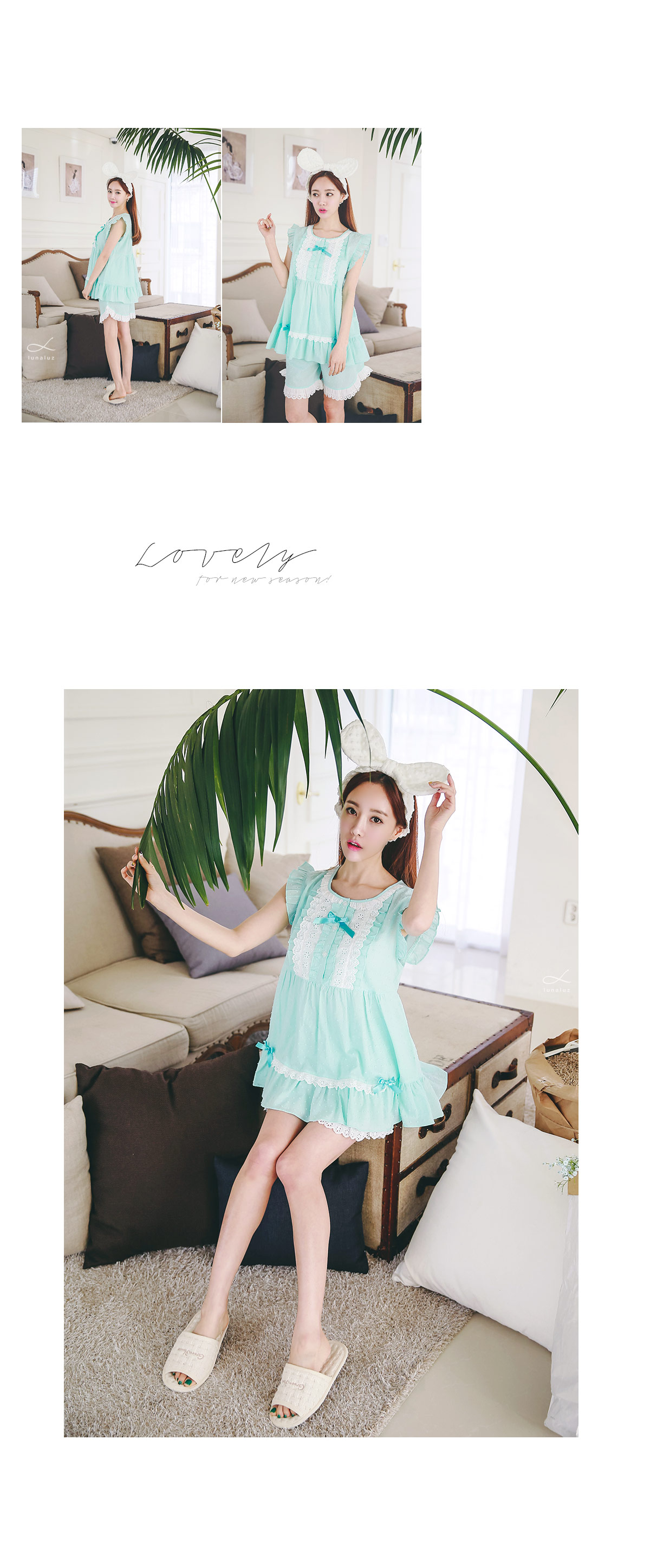 보기만해도 정말 정말 시원한 느낌의 민트에요 >.< ! 일반 순면 원단이 아닌 포인트가 있는 우라기리 원단을 사용하여 제작하였어요~ 그래서 시원하면서 고급스러운 느낌이 드는데요~ 품이 낙낙해서 66size까지도 무난하게 착용하실 수 있어요~ 바스트 부분을 여러겹으로 덧댄 아이보리 컬러의 레이스 장식과 촤르르 내려오는 핏이 정말 귀여워요~ 하단에 레이스 장식을 달아주어 포인트를 주었고요. 팬츠는 양 사이드의 길이를 확 짧게 잡아주어 다리 라인을 좀 더 슬림하고 길어보이는 효과를 준답니다.~ 전체적으로 러블리하면서 귀여워보여 특별한 날에 입기에도 최고인 잠옷이에요 : ) 상큼한 컬러와 발랄한 분위기의 디자인이 어우러져 분위기를 한 층 더 UP 해준답니다^^