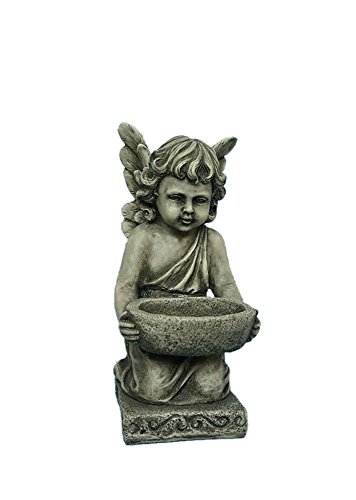 - Standing at 15.5 inches tall, this decorative statue is an excellent addition to your backyard, patio or garden as a bird feeder or a birdbath. This statue can also be displayed in your home and used as a candy dish, key holder or change collector. The young angel holding a bowl makes for an elegant and welcoming statue for any visitor to your outdoor oasis or indoor sanctuary. Made of high quality resin and detailed with a grey faux stone finish. Buy it for yourself or as a gift for a loved one.