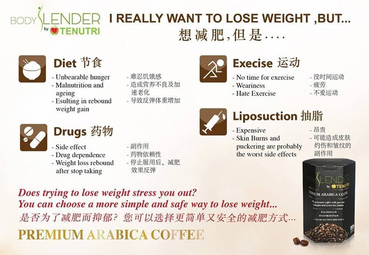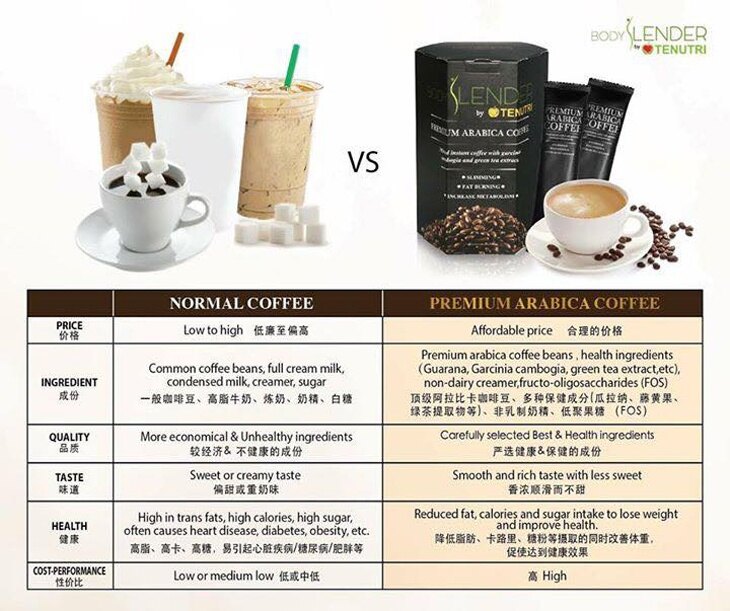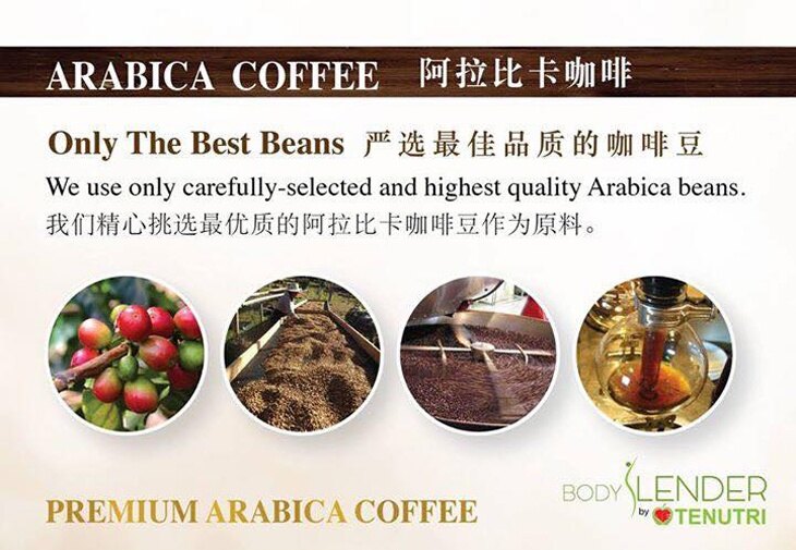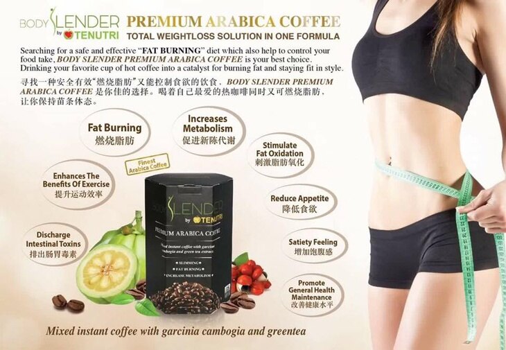 Body Slender Premium Arabica Coffee Body Slender Premium Arabica Coffee is a total weightloss solution formulate with the carefully-selected and highest quality Arabica coffee beans and other plant extracts. It is a safe and effective "Fat Burning” diet which also helps to control your food take. The best choice for people who enjoy the characteristic aroma and flavor of coffee. Benefits: