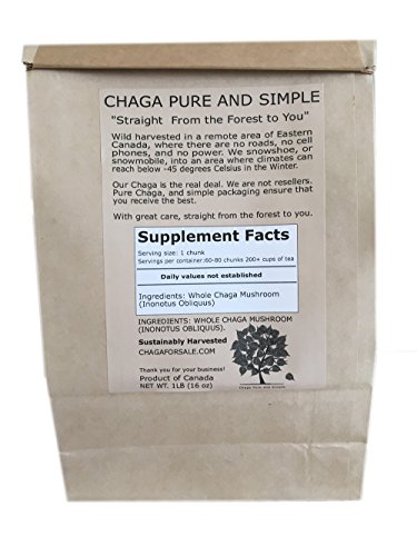 -. Feature : Wild Harvested only from living Birch Trees, in an old growth forest in Eastern Canada. / Very pure Canadian Chaga, harvested in a very remote area where there is no automobile traffic, no cell reception, no power. / Dried thoroughly. Caffeine free, organic, pure, premium quality. Only the best. / Ships from Maine, USPS P.R.Iority Mail. Fast shipping! / Chaga may be brewed several times, just store in the freezer, in between batches of tea.