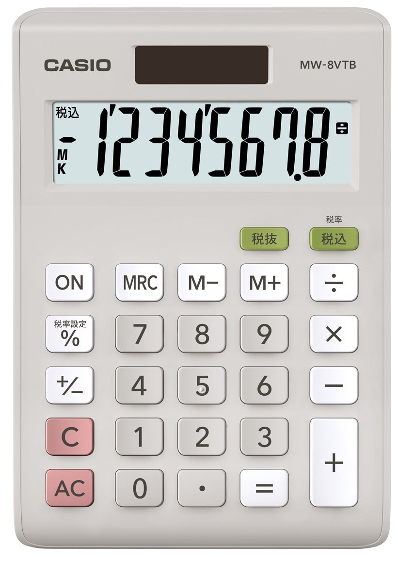 ●桁数: 8 ●メモリー:1 ●電源種類:T・W・P(太陽電池と補助電池の併用)(LR54) ●電池数:1 ●電池寿命:約3年 ●大きさ(奥行×幅×高さ mm):147×103×28.8 ●質量(g):110 機能:税計算,計算状態表示,マルチ%,四則定数計算,概数計算,+/-(サインチェンジ),キーロールオーバー機能(早打ち機能)
