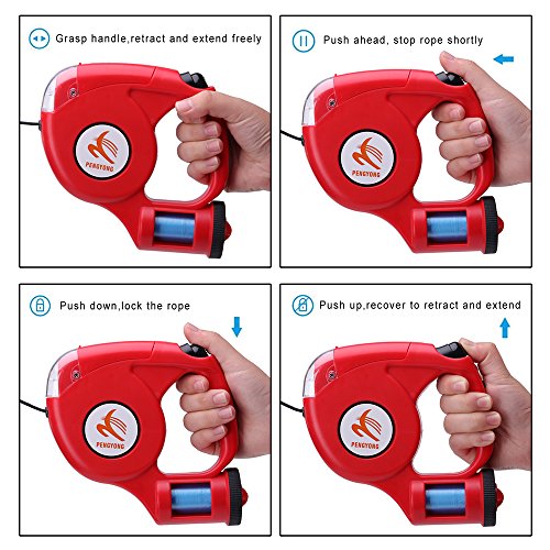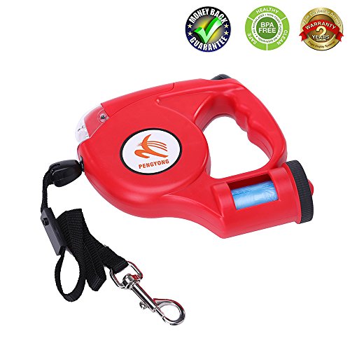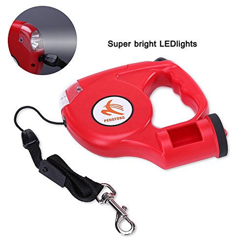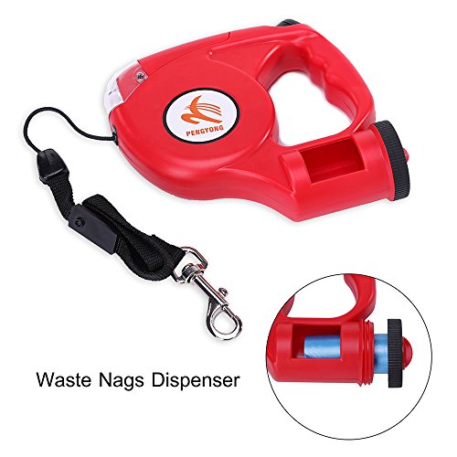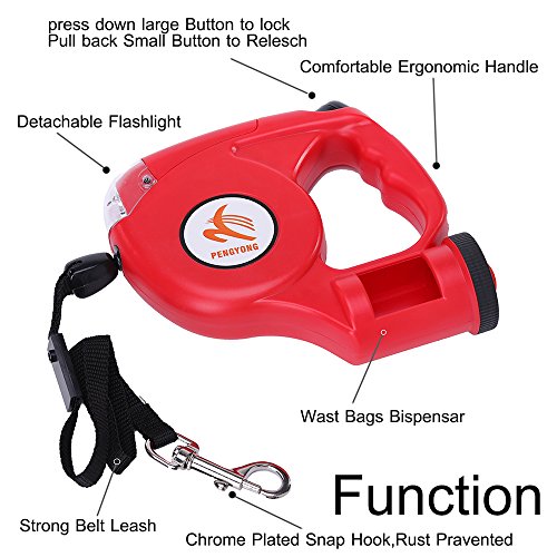 Product Features ● Dog on Leashes Simple Brake Unlock System, only one click you can brake and release your pets, it's easy and convenient for you to keep your dog at control, when the leash working, the rope extend slowly with the direction of the dog, now your dog enjoys freedom and comfortable, Push the key ahead, stop the rope shortly, Put the key down, the leash lock, the rope stop retract and extend, and when push key up, the rope will recover to retract and extend to work. ● Durable Leash Material, retractable nylon leash 15ft in length, up to 110Ibs in weight; Ergonomic handle design, it is very light and fits in your hand properly; ABS casing and anti-slip comfort grip allows the greatest ease when you walking the dog. ● A bag dispenser (FREE PLASTIC BAG) which allows you to clean up quickly anytime; ● Four powerful LEDs, Requires two AA batteries (not included), the bright light provides you with an illuminated, better, and safer during a nighttime walk; ● We offer 2 YEARS RETURN OR REPLACEMENT IN FREE. ● If you are thinking of purchasing a adoptable retractable leash, then PENGYONG Retractable Dog Leash is your best choice for walking, training, running, jogging and other outdoors activities ! Item Specification ● Product name: Retractable Dog Leashes ● Product shell: ABS ● Rope Material: Polyester ● Rope Length: 4.5M Rope 0.5M Flat Ribbon ● Light: 4 LED Flashlight ● Pulling: 35KG ● Weight: 220g ● Batteries: Two AA Batteries ● Hook: Zinc Aloy ● Packing: Blister Packaging ● Weight: 220g ● Batteries: Two AA Batteries ● Hook: Zinc Aloy ● Packing: Blister Packaging