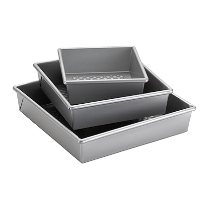 - The round cake pan set features durable, folded aluminized steel construction and wire-reinforced rolled rims to provide strength and stability