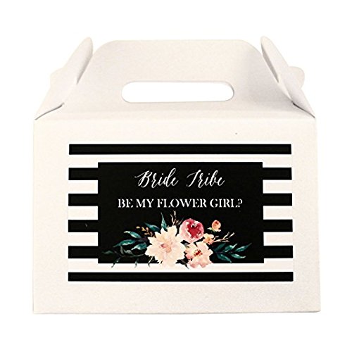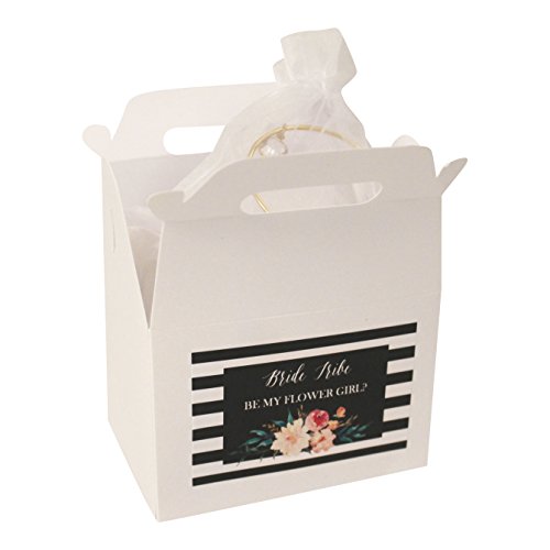 FLOWER GIRL PROPOSAL LABELS - You little flower girl will feel like a princess when she opens her little gift box. These special gifts are not your typical thank you boxes you can find in the store. They have a custom designed black and white striped floral label with the popular phrase Bride Tribe and a charming message that says Be My Flower Girl?