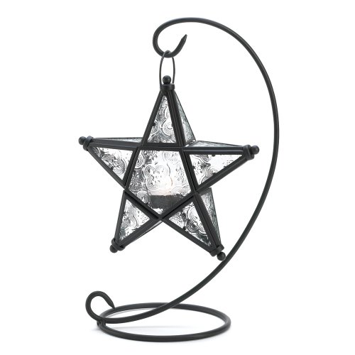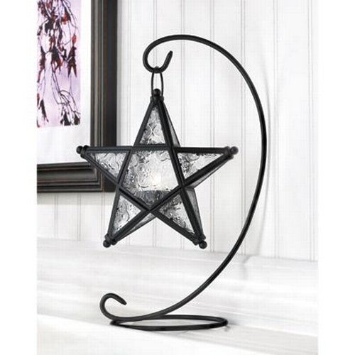 -. Feature : Striking star shaped tabletop candle lamp / Slender metal frame and curlicue with glass panels / Lit candle inside fills any decor with a dazzling glow / Excellent decor item for festivities and get-togethers / Elegant gift idea for friends and family