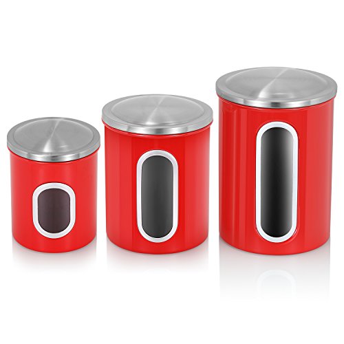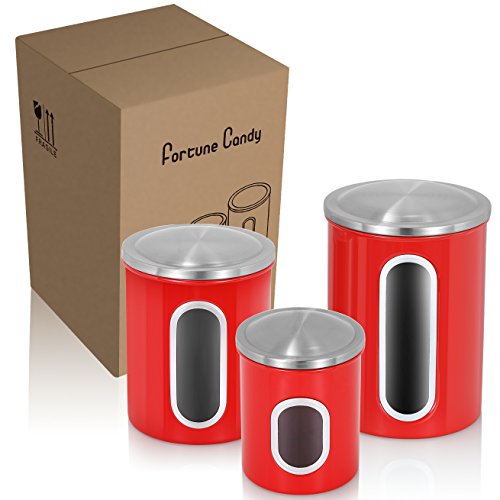 Product Specifications: Color: Bright Red Design: Gloss Finish Material: Carbon Steel with Stainless Steel Capacity: 8oz, 12oz 16oz Product Size: Small - 10X10X12.5cm/3.9x3.9x4.9inch Medium - 12.5X12.5X16.3cm/4.9x4.9x6.4inch Large - 13.6X13.6X20.3cm/5.4x5.4x8.0inch Product Net Weight: 36.5ounce / 1.03kg Package Including: 1x Set of 3pcs Fortune Candy Kitchen Canisters Warranty: 5 Year Warranty for All Fortune Candy Canister Set Fortune Candy Brand All Fortune Candy brand products are designed by our exclusive team of designers and creators who dedicated their creativity and enthusiasm towards design the simple and stylish products which sets us apart and ensures that Fortune Candy is able to retain a strong and proud sense of its own identity through design, quality, function, manufacturing, customer service and of course innovation. 0