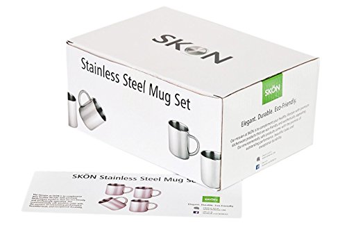 SKÖN Double Wall Stainless Steel Mug Set allows you to enjoy your beverages in an environmentally friendly, durable and hygienic cup that will not leach harmful chemicals into your drink. It is manufactured from highest quality, food grade 304 Stainless Steel that is guaranteed rust proof and will last for a very long time. It is BPA free.