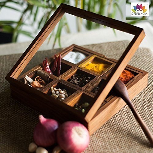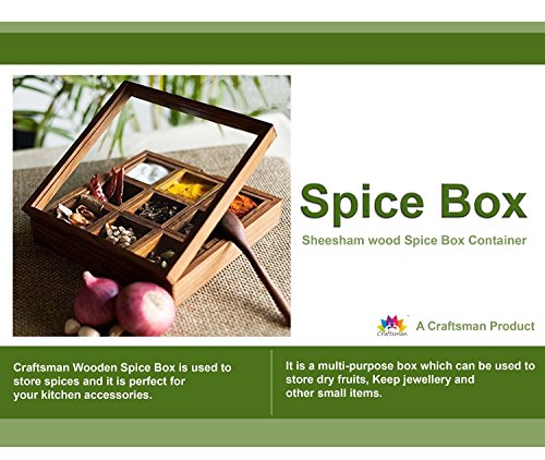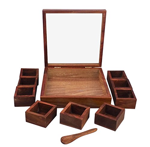 -. Feature : Spice Box Material: Sheesham Wood spice box container and glass lid. / Spice Box Size: Length: 8 inches, Breadth: 8 inches, Height: 2.0-2.25 inches(approx) / Quantity: 1 wooden spice Box with 9 containers and with 1 spoon / Do not expose directly to water. Just wipe out with soft cloth piece. / Spice Box Style: Antique, Decor, Ethnic, Contemporary, Handcrafted, Unique, Casual, Elegant, Lightweight, Eco-friendly, Kitchenware