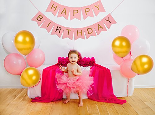 PINK HAPPY BIRTHDAY BANNER DECORATIONS SET - Pink and Gold Birthday Party Decorations | Pink Gold snd White Theme Balloon | Party Supplies for Princess, First, 2nd, 3rd, 5th, 7th, Girl, Women or Adult