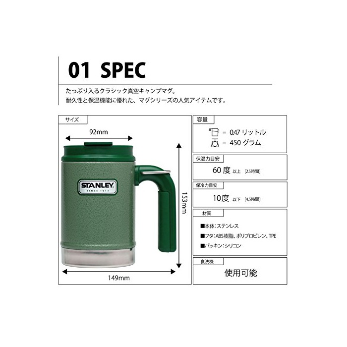 원본상품명: STANLEY(スタンレ) クラシック空スチルキャンプマグ 0.47L グリン 01693-007 (日本正規品)