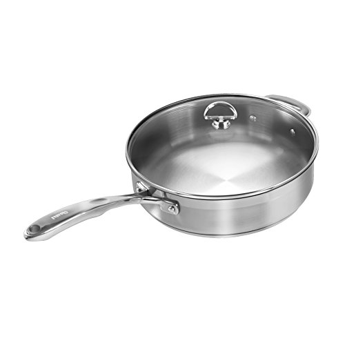 Made from strong Japanese steel, the construction and design of the Induction 21 Steel cookware line guarantee superior quality. Each piece has copper melted into the steel, which effortlessly conducts heat quickly and evenly. Titanium is also added for strength and durability to endure everyday cooking. To ensure healthy cooking, the steel is nickel free to prevent allergic reactions to nickel. The tempered-glass lid makes it easy to monitor cooking and the dripless pouring rim reduces spillage along the side of the body. The sauté skillet is perfect for sautéing chicken breasts or fish fillets. It features a wide flat bottom, straight sides to maximize capacity, cool to the touch, long ergonomic handle and shorter helper handle for ease in transfer and weight balance. This is the best steel for magnetic induction and perfect for all cooktops. Oven safe. Dishwasher safe. Limited lifetime warranty. Product dimensions: 3" height 11" opening diameter 10.25" exterior base diameter.Feature