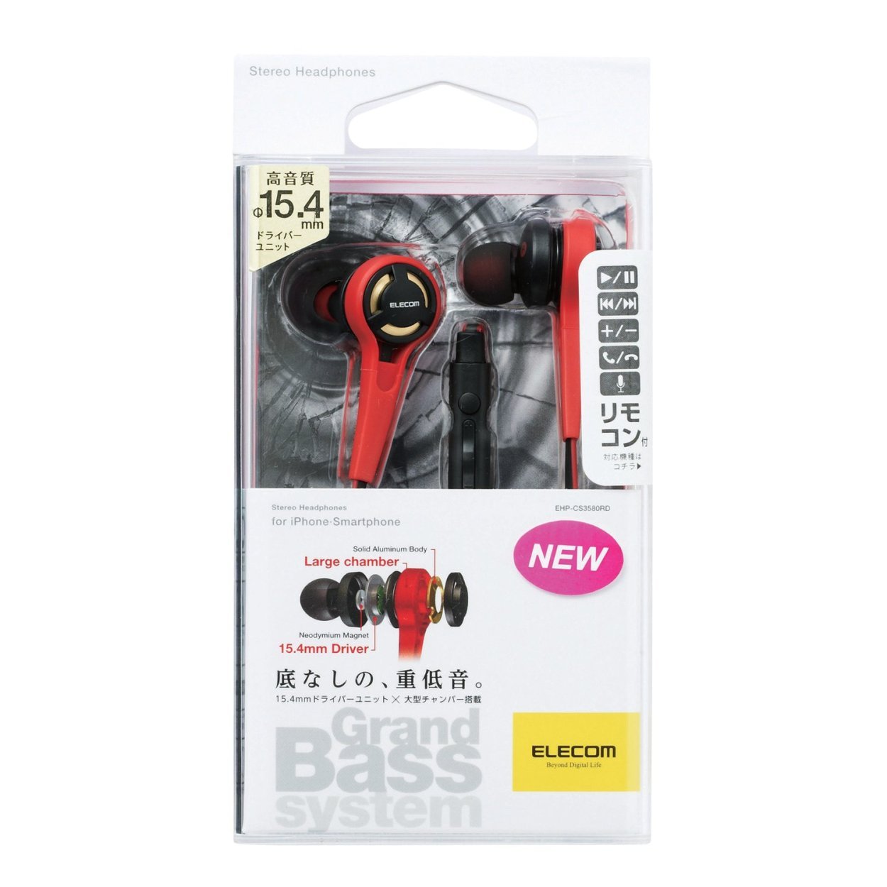 It is a model with a microphone for a smartphone of an ear plug type stereo headphone equipped with the GrandBass system realizing the bottomless deep bass.