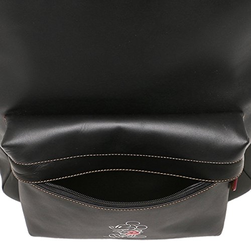 Product Description Details Glove calf leather Inside zip and multifunction pockets Inside laptop sleeve Zip closure, fabric lining Outside zip pocket Adjustable shoulder straps 13 3/4" (L) x 17 1/4" (H) x 6" (W) Disney x Coach 0
