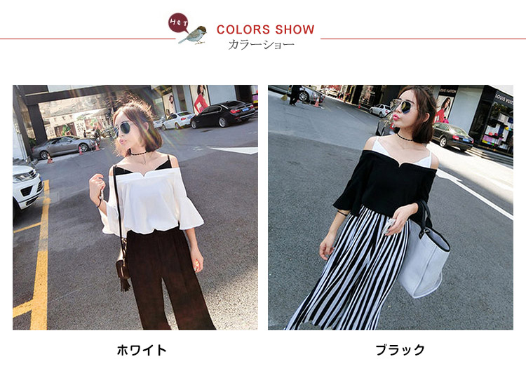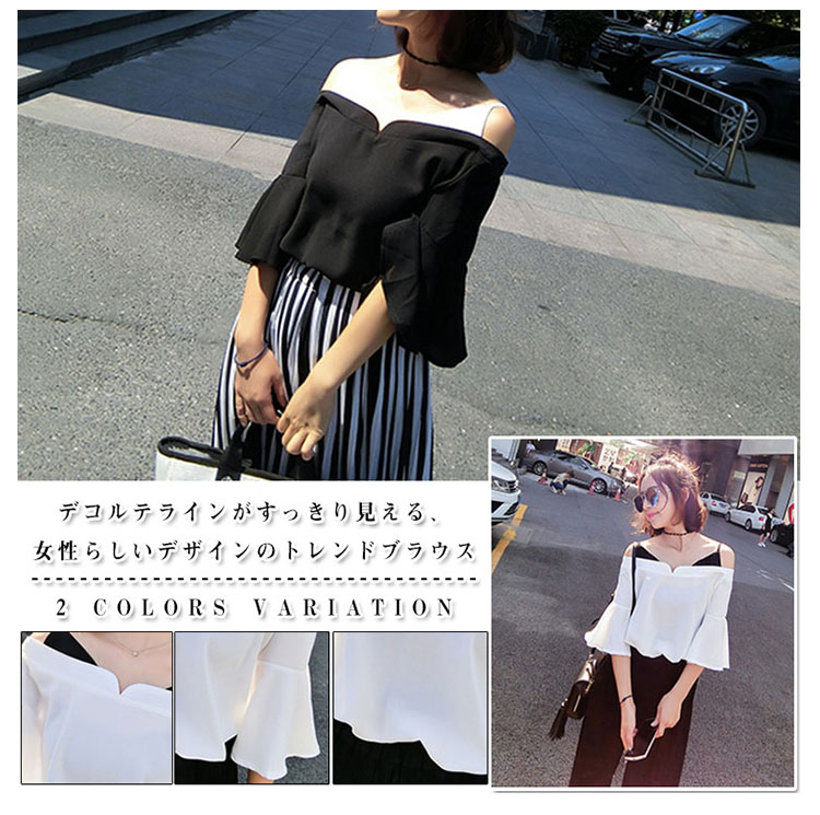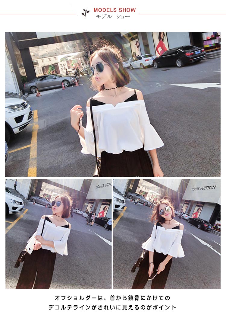 | デコルテラインがすっきり見える、女性らしいデザインのトレンドブラウス。オフショルダーは、首から鎖骨にかけてのデコルテラインがきれいに見えるのがポイント清涼感のある風合いで,これからのシーズンスタイルにも重寶すること間違いなし | |