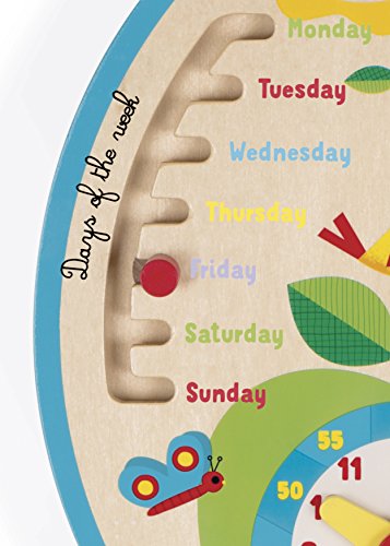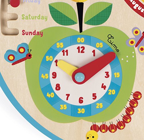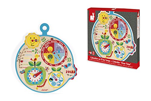 Janod calendar - over time is a wooden wall calendar that has something for your child to turn, twist and spin every day! the 13.5in. (35cm) diameter colorful wooden calendar hangs on a wall and acts like an activity center with dials, a knob and a slide. Every day, kids have fun while learning, by working the nose and spinner on the sun to set the date, sliding the knob into the correct day of the week and setting the dial to the correct weather. Every month they can turn the dial to the correct month making sure to stay in the proper season. Every new year kids can spin the correct year (until the end of 2020). plus, whenever they want, there’s a clock, to put in the current time or set to remind them of an upcoming event. Includes an all wooden, hanging activity center. Recommended for children 3 years of age and older.Feature