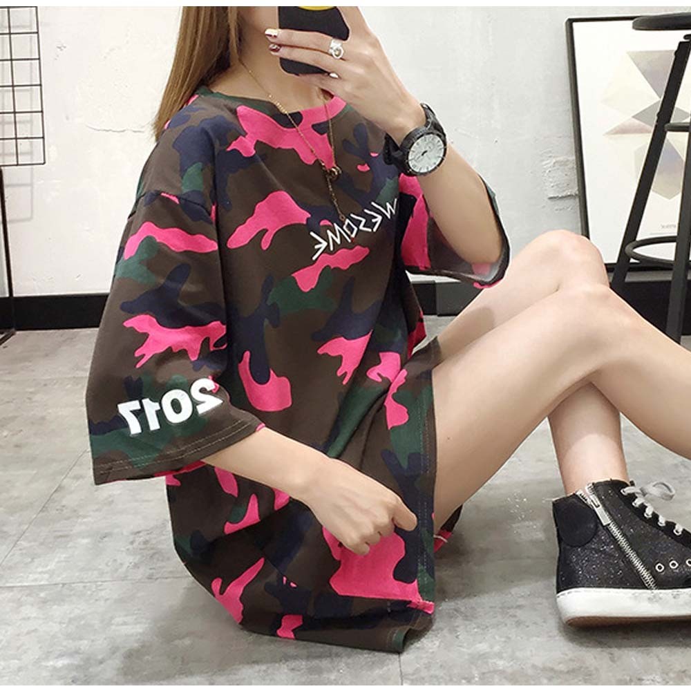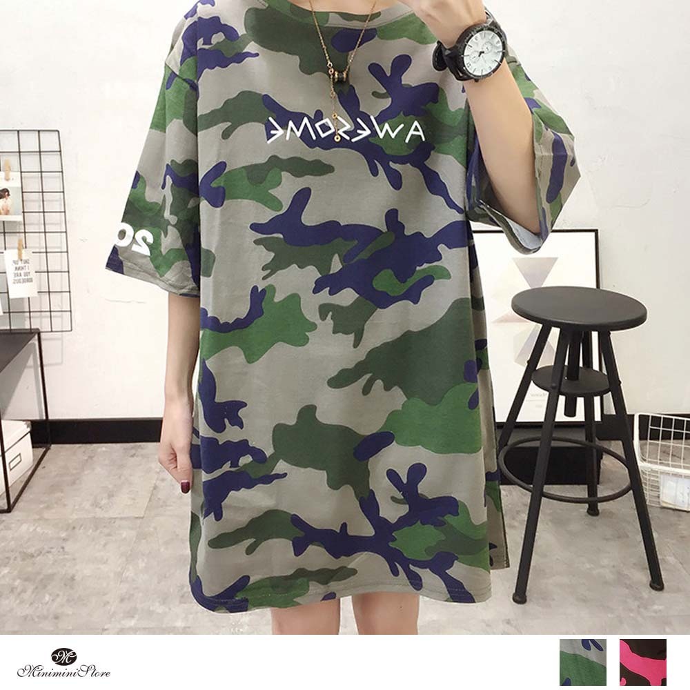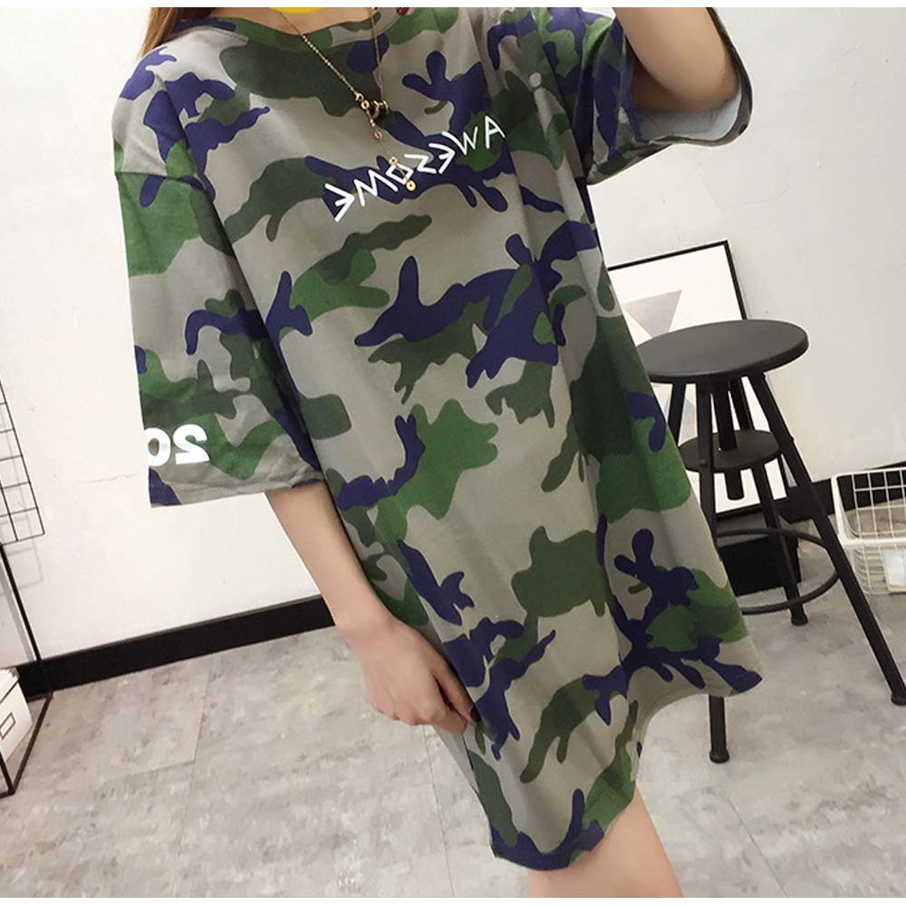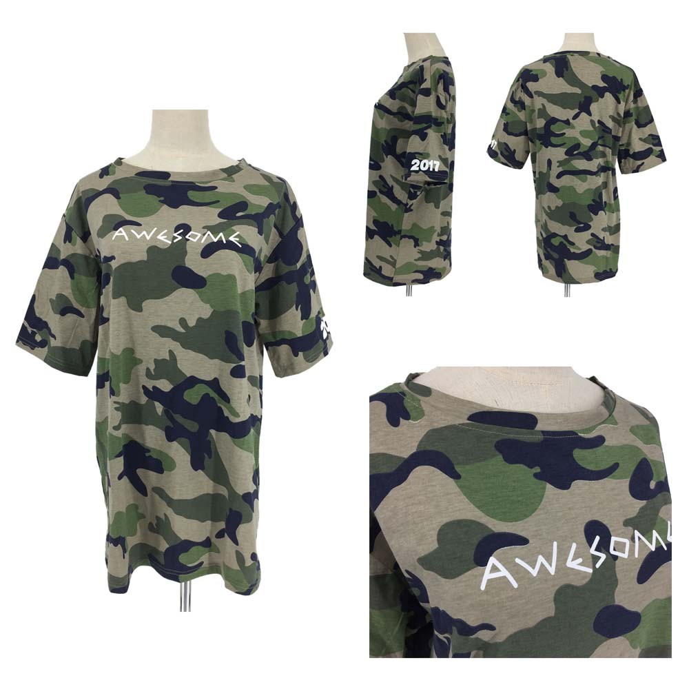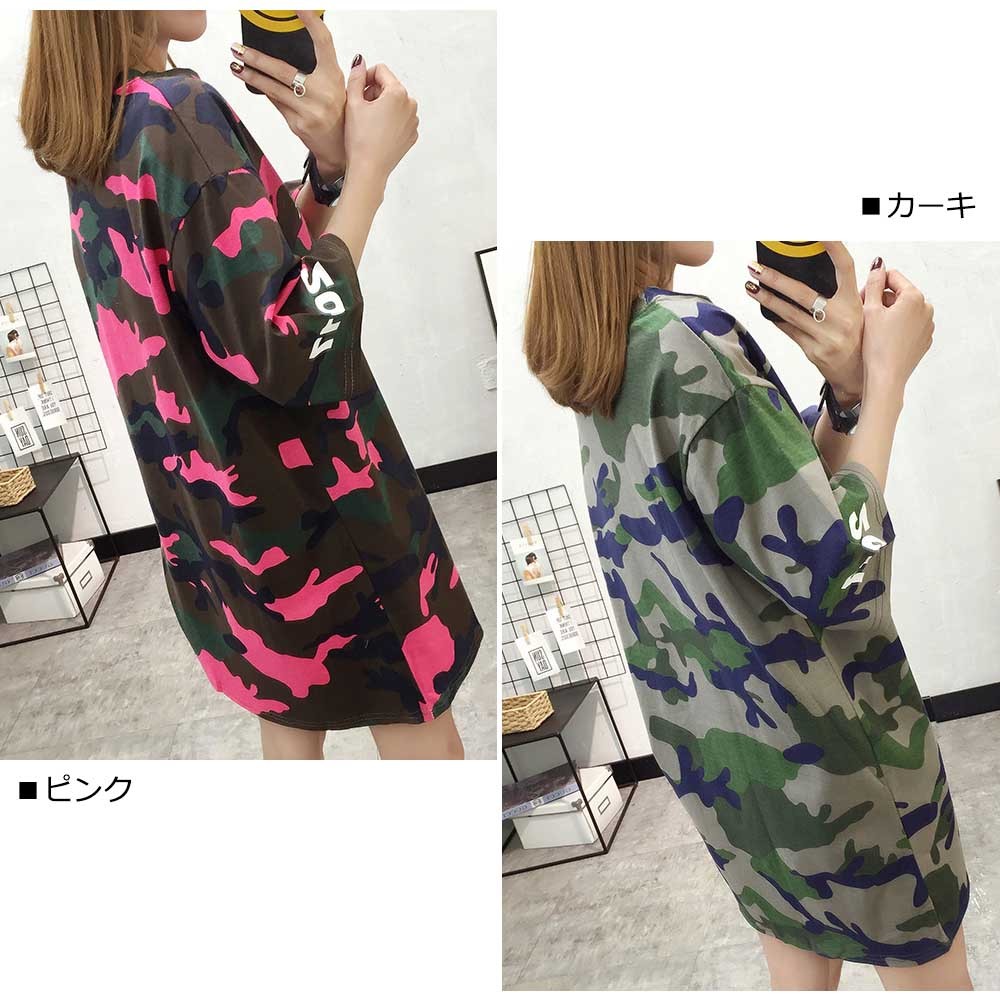 カモフラ調総柄と英字ロゴがおしゃれ可愛いロング丈ゆったりtシャツ