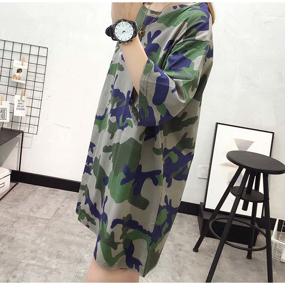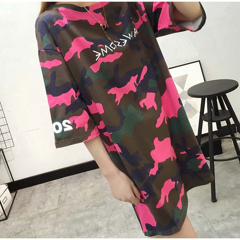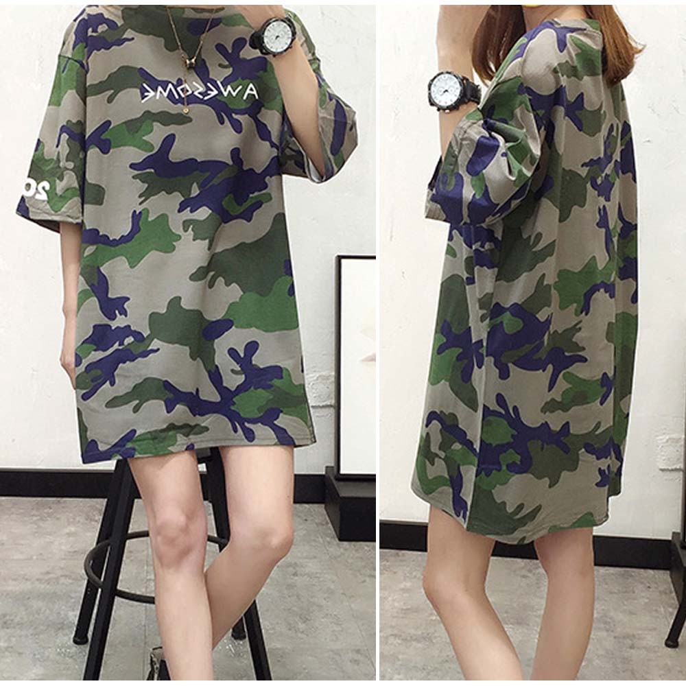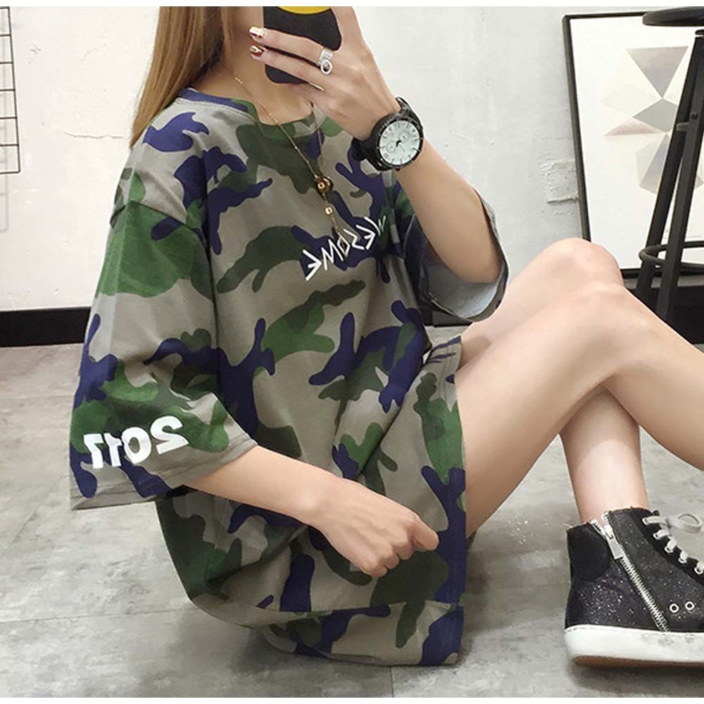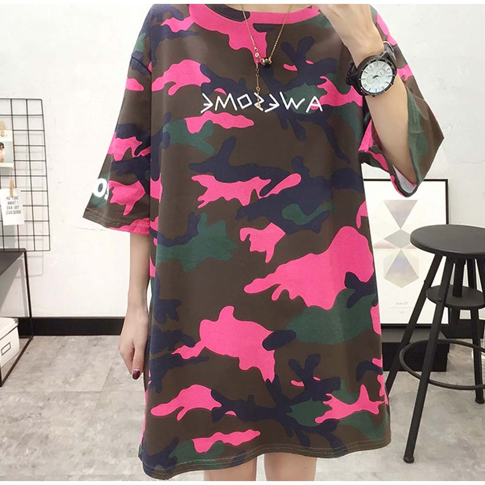 カモフラ調総柄と英字ロゴがおしゃれ可愛いロング丈ゆったりtシャツ