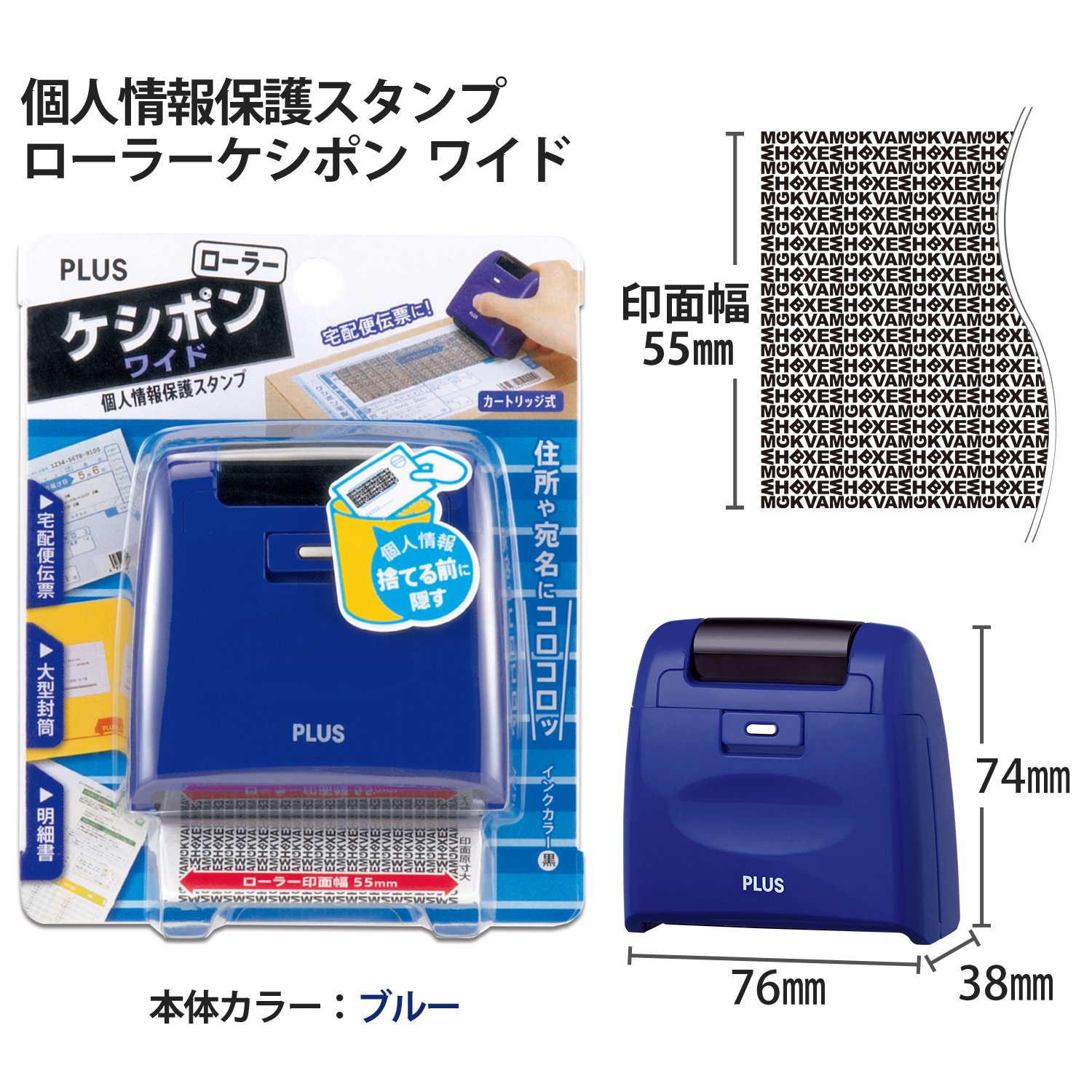 <大切な個人情報を保護するスタンプ、宅配伝票や明細など幅広い範囲に便利な「ローラーケシポン ワイド」 規格:ワイド / 印面幅:55mm / 本体カラー:ブルー / インク色:黒 外形寸法:W76×D38×H74mm / 捺印距離:約50m分(800回捺印相当、1回60mmの場合) 材質:本体=PS・ABS・POM、カートリッジ=ABS・POM・PE、インク:油性顔料 ※インク液の補充はできません。交換時は別売専用交換インクカートリッジ、38-129(IS-017CM)をご利用ください。