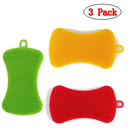 (Set of 3)2 sided Food-grade Antibacterial Silicone Sponge Multipurpose Scrubber for Kitchen, Brush Pot Pan Dish Bowl, Bathe,Wash Fruit and Vegetable, Pot Holder