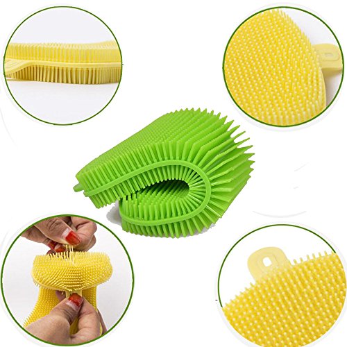 - MATERIAL:The scrubbers are made of food grade silicone, which is naturally since it is not porous like regular sponges and cloths are,Soft, flexible and scratch free, soft and flexible enough to get into any glasses or corners of pans or boilers, with soft brush bristles