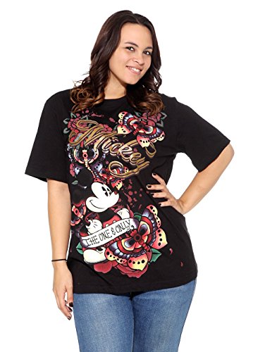 Disney plus size t-shirt with Mickey Mouse in a tattoo style graphic print. The 100% cotton tee is black. The shirt has short sleeves, a crew neck and a straight cut for a unisex style fit.Feature