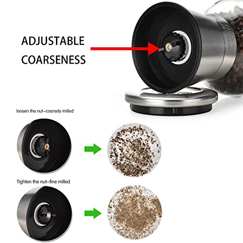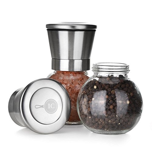 Studio : Integrity Chef Publisher : Integrity Chef Product Description Our Integrity Chef salt and pepper grinder set is made of the highest quality glass and stainless steel coupled with a ceramic grinder made to last for years of regular use. With covered lid caps, our salt and pepper grinders keep your spices fresh longer. - Adjustable setting for desired coarseness - Easy-to-remove screw off top makes refilling a breeze -100% satisfaction guarantee 0