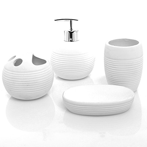-. Feature : Contemporary 4-piece ceramic bathroom accessories set featuring horizontal ribbing accents. / Features 1 soap dish, 1 tumbler, 1 soap or lotion dispenser, and 1 toothbrush holder. / Perfect as a thoughtful gift for a housewarming or other special occassion. / **Official MyGift® product.** / Approximate Dimensions (in inches): Soap Dish - 5 W X 1.25 H X 3.25 D; Toothbrush Holder - 3.5 H X 4.25 Diameter; Tumbler - 3.75 H X 3.25 Diameter; Liquid Soap Dispenser - 5 H X 4.25 Diameter.