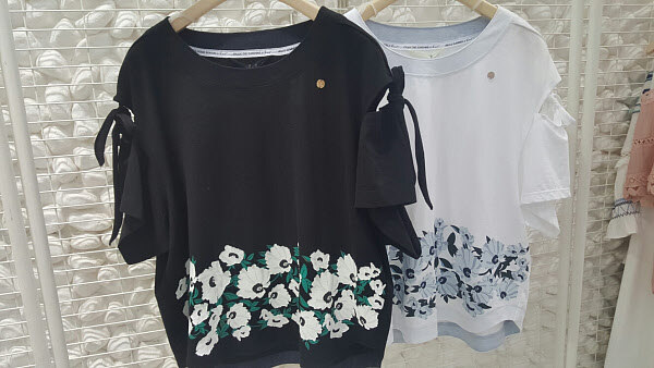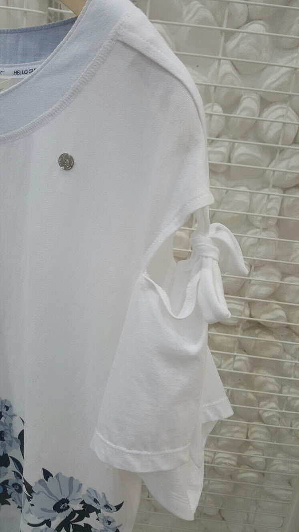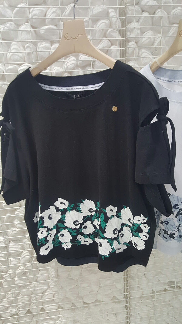 지컷 꽃프린트 티셔츠 어깨 리본 오프숄더 스타일