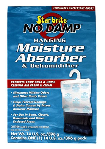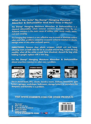 -. Binding : Kitchen -. Brand : Star Brite -. Color : Clear -. Feature : ***Ships from Florida*** 4 Pack Deal! / Designed to help prevent musty odors in stored boats, RVs or seasonal homes. / Absorbs airborne moisture to help prevent mildew smells. / Eliminates mildew odor and other musty odors. / Protects boats in storage, vacation homes, basements and other enclosed areas. Features spillproof bag to safely hold collected moisture. -. IsAutographed : 0 -. Label : Star Brite -. Manufacturer : Star Brite -. MPN : STA-085470 -. PartNumber : STA-085470 -. ProductGroup : Home -. ProductTypeName : HOME -. Publisher : Star Brite -. Studio : Star Brite -. Title : 4 Pack No Damp Hanging Moisture Absorber & Dehumidifier Star Brite 85470 RV Boat