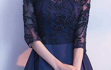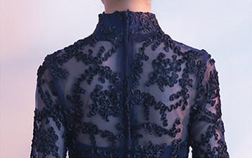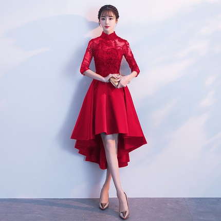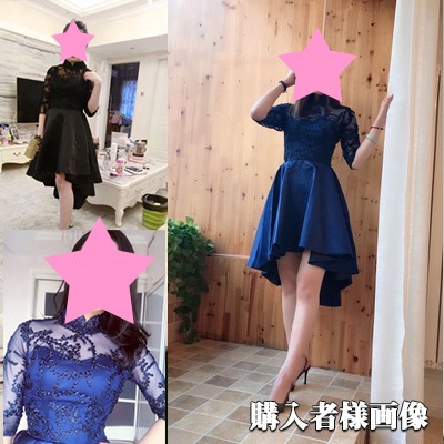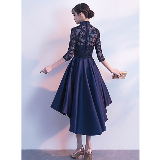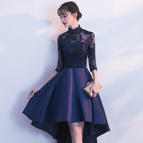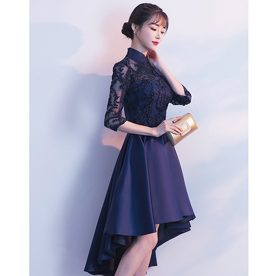 エレガントなスタンドカラーのパーティードレス。