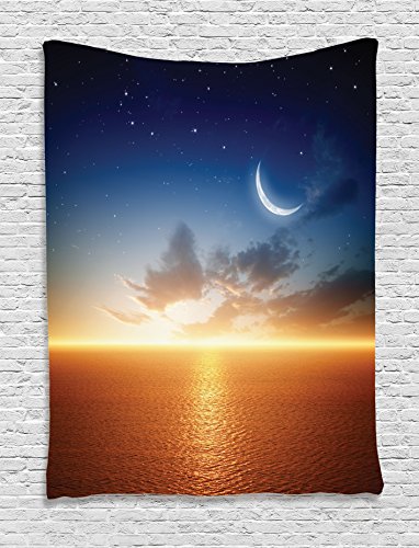 Ocean Tapestry Decor by Ambesonne, Sunset Sky with Moon and Stars Alluring Horizon Scenery Fantasy Artwork Print, Bedroom Living Room Dorm Wall Hanging Tapestry, Navy Yellow Orange
