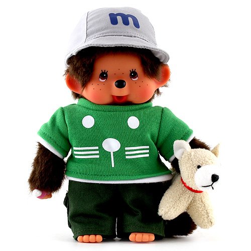 Niedlicher Monchhichi-Jung in sportlicher Kleidung: Mit Hose, Shirt und Basecape. Aus kuscheligem Plüsch gefertigt, mit weichem Körper. Mit kleinem Plüsch-Hund.
