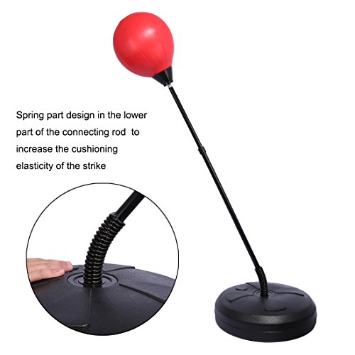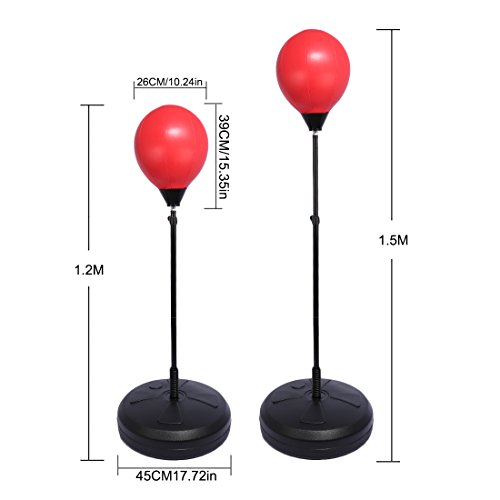 .Color: Black Red .Material: PU Metal .Overall Size: 45*45*120cm .Adjustable Height: 120-150cm .Punching Ball: 39*26cm .Base Diameter: 45cm .Adjustable Caliber of Boxing Gloves: 5-11cm .Product Weight: 2402g .Package Dimensions: 44*14.5*51cm .Package Weight: 2908g .Packing: Carton Bag