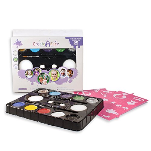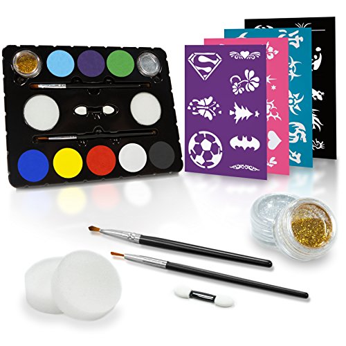 Face Painting Kit + 32 Stencils (Paints 50 - 80 Faces) Halloween Makeup, Non-Toxic Paint - Vibrant Colors, Done-For-You Stencils, Shimmering Glitter Gels, Versatile Brushes, Sponges, Applicators