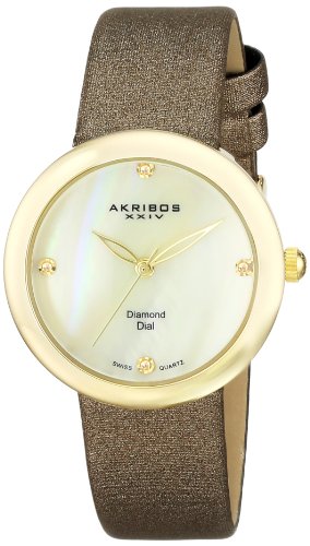 Studio : Akribos XXIV Publisher : Akribos XXIV Binding : Watch Product Description This Akribos XXIV women's beautifully designed watch is simple enough to wear during the casual work day and elegant for an evening out. Genuine diamonds grace the Mother-of-Pearl dial and sparkle with the satin band. 0
