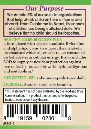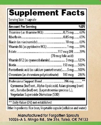 Studio : Forgotten Sprouts Publisher : Forgotten Sprouts Binding : Health and Beauty Product Description Designed to Promote Healthy Carbohydrate Metabolism. Formulated with select botanicals, B-vitamins, and alpha-lipoic acid to support the body's natural carbohydrate metabolism to help control intestinal absorption of digested carbohydrates and also facilitate its transport into the cells. SUGGESTED USE: Take 1 capsule twice daily. THE FORGOTTEN SPROUTS' PURPOSE: We donate 5% of our sales to organizations that help at-risk children here at home and abroad. From Oklahoma to Nepal, thousands of children are being trafficked daily. We believe that no child should be forgotten. These statements have not been evaluated by the Food and Drug Administration. This product is not intended to diagnose, treat, cure, or prevent any disease. 0