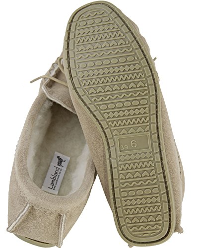 -. Feature : Lambland are renowned for quality leather and sheepskin / A Quality British product, handmade in the West Country of England / Traditional Suede Moccasin with hard wearing sole, warm and comfortable, fully adjustable lace tie / Handmade exclusively for Lambland / Please Note: Our items ship from The United Kingdom