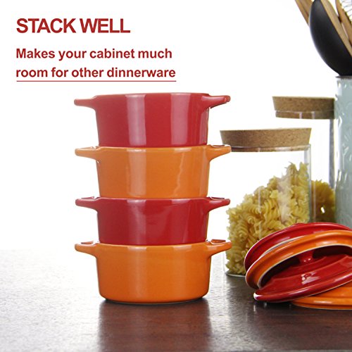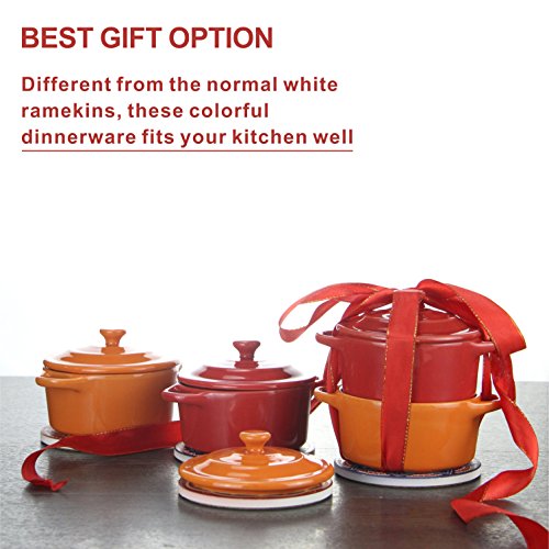 RED & ORANGE RAMEKINS WITH LID - You will get two Tomato Red and two Pumpkin Orange ramekins, each ceramic ramekin has a lid. I am 100% sure that you will love them. Because you no longer bother about dust and insects when there is leftover, dessert and butter.