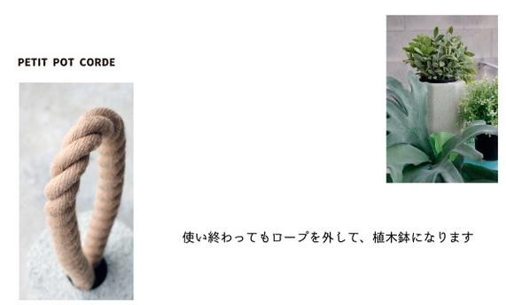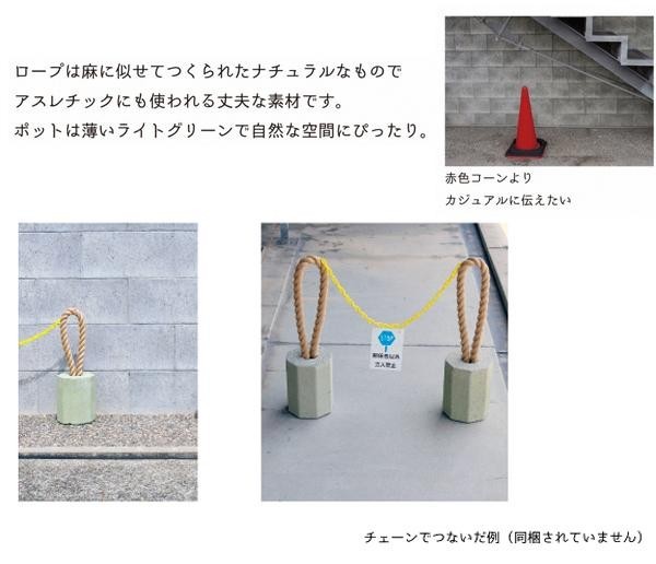 | 丈夫なロープとコンクリートのコンビネーションの、オシャレな案内スタンド。赤色コーンよりもカジュアルに、生活空間などの雰囲気を壊さずに設置して頂けます。本体はコンクリートの為、風に飛ばされず安定感があります。使用後のセメント部分はロープを外して植木鉢としてもお使いいただけます♪ |