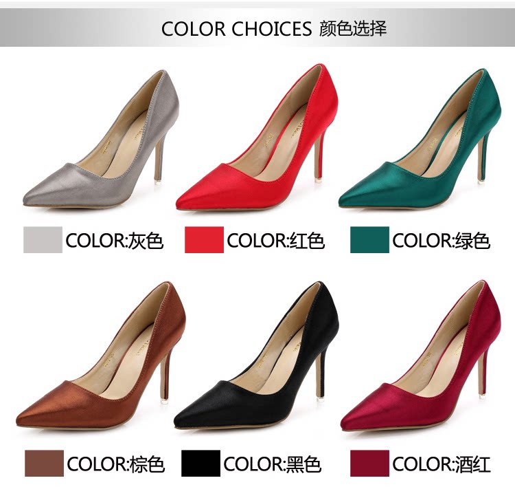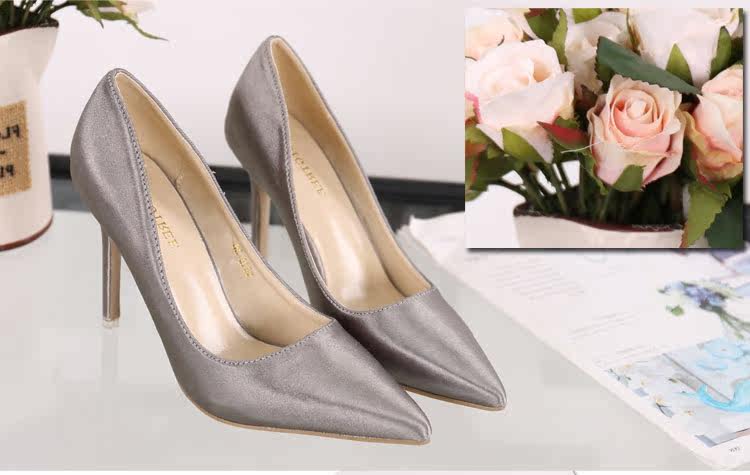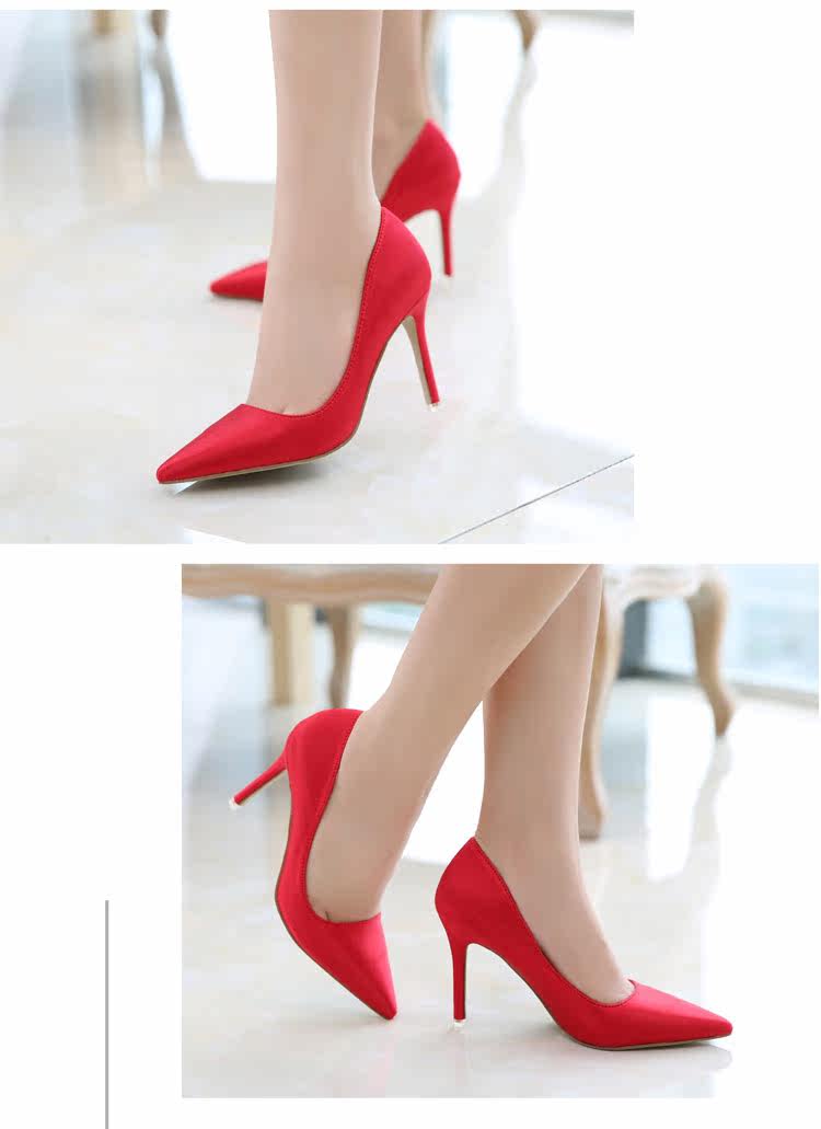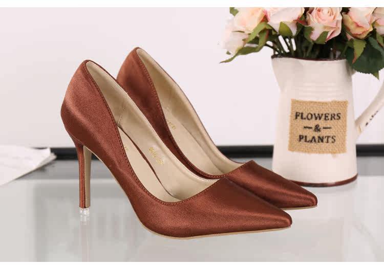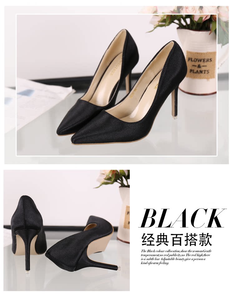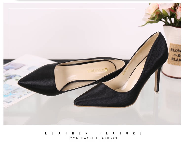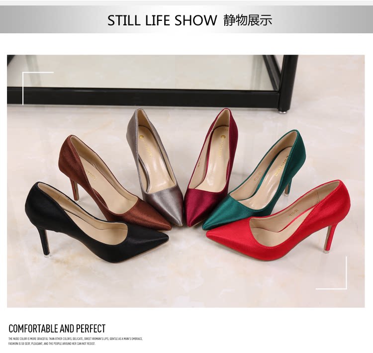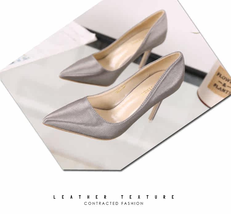 高跟鞋细跟尖头鞋绸缎女单鞋秋季新款浅口欧美女鞋OL职业鞋