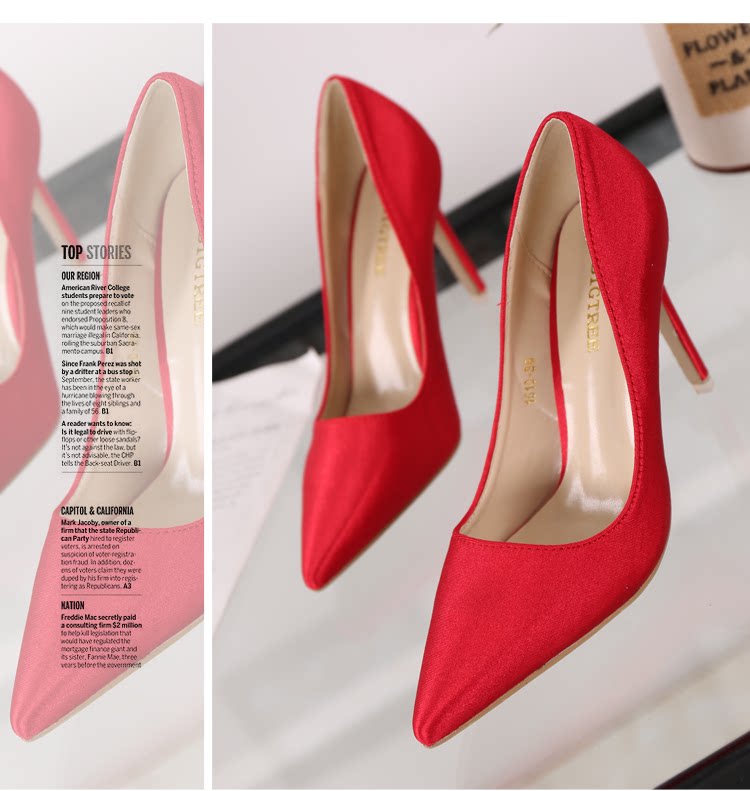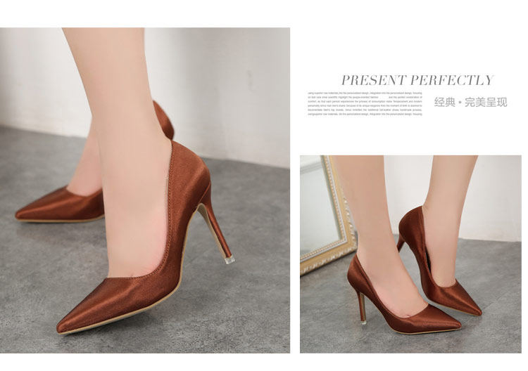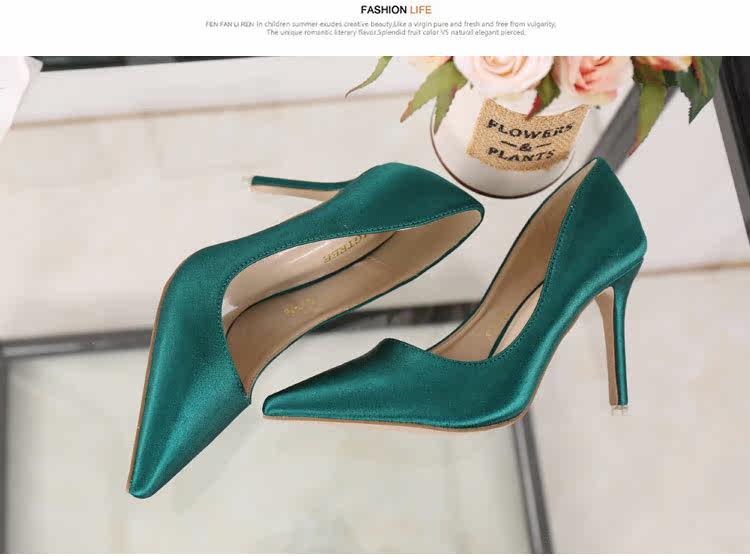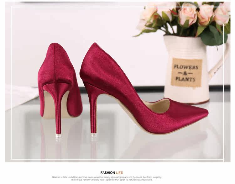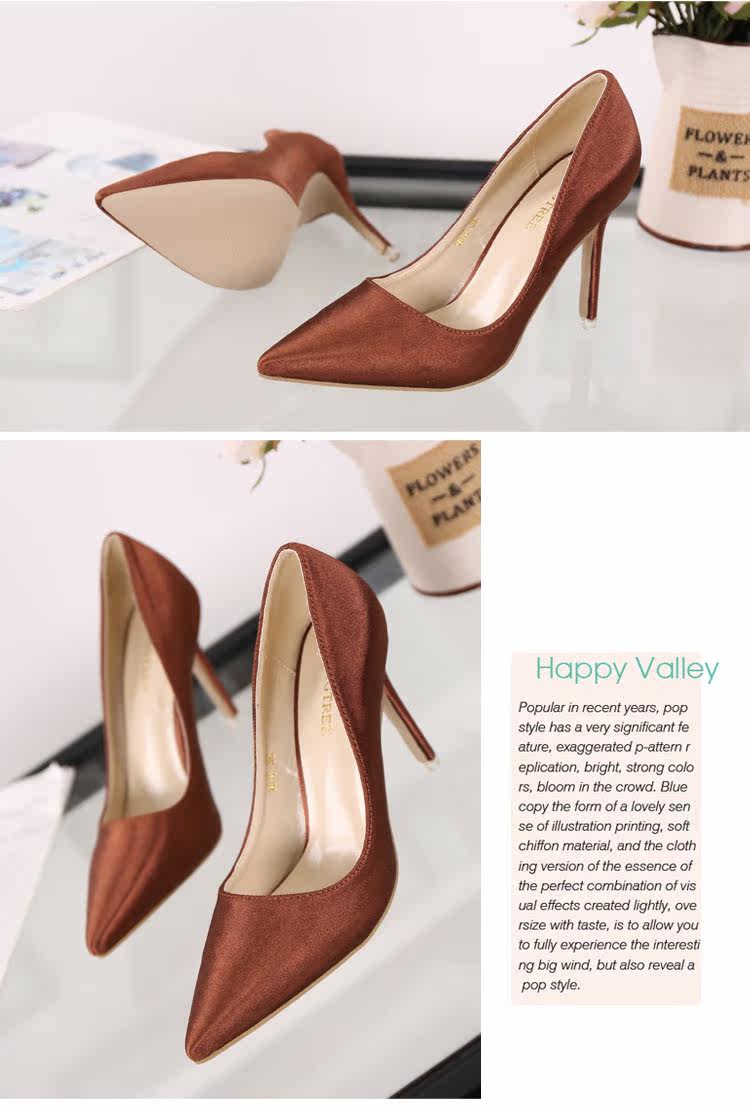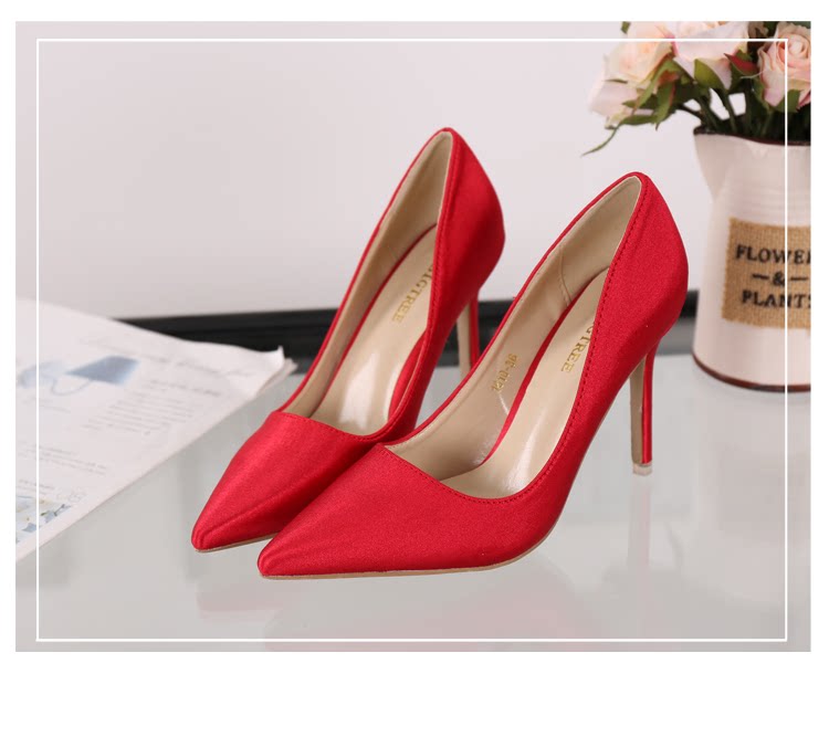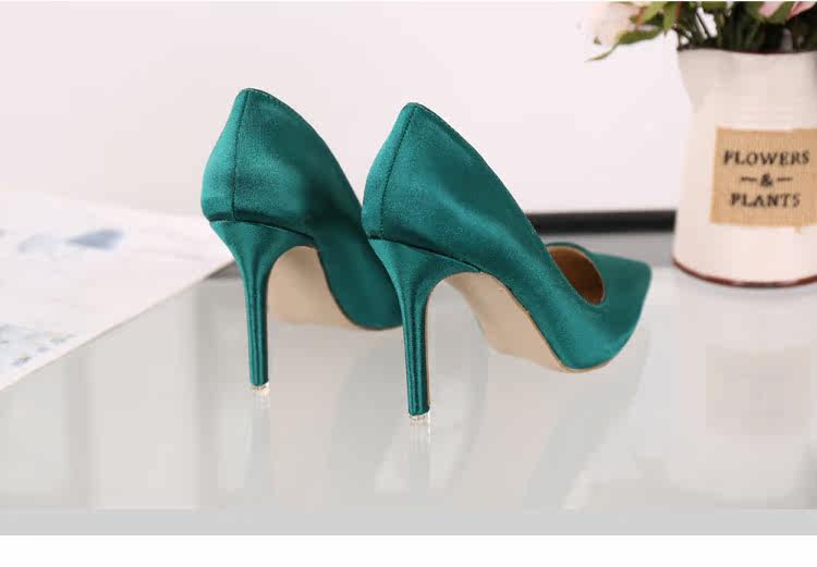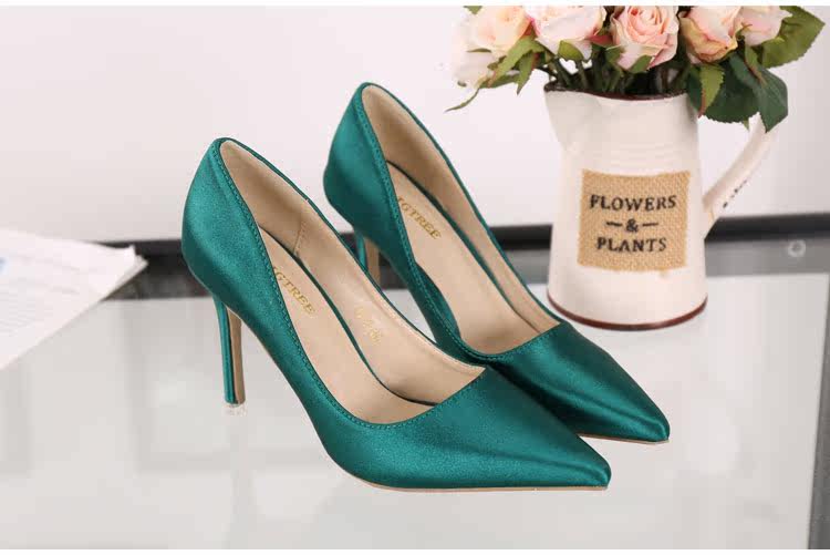 高跟鞋细跟尖头鞋绸缎女单鞋秋季新款浅口欧美女鞋OL职业鞋