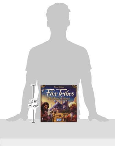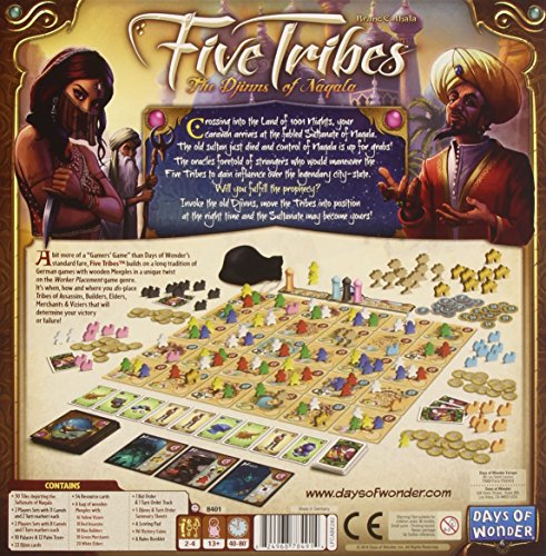 Crossing into the Land of 1001 Nights, your caravan arrives at the fabled Sultanate of Naqala. The old sultan just died and control of Naqala is up for grabs! The oracles foretold of strangers who would maneuver the Five Tribes to gain influence over the legendary city-state. Will you fulfill the prophecy? Invoke the old Djinns, move the Tribes into position at the right time and the Sultanate may become yours! Designed by Bruno Cathala, Five Tribes is a bit more of a "Gamers' Game" than Days of Wonder's standard fare. The game builds on a long tradition of German games with wooden Maples in a unique twist on the Worker Placement game genre. While the rules are quite easy to learn and understand, implementing a winning strategy will take a calculated approach. In this worker displacement game, you score by carefully maneuvering the Five Tribes of Maples over the tiles that make up the ancient city-state of the Sultanate of Naqala. You need to look ahead to determine what moves will not only position you to score well, but put your opponents at a disadvantage. It's when, how and where you dis-place the Five Tribes of Assassins, Elders, Builders, Merchants & Viziers that will determine your victory or failure! Included are: 30 Game Tiles depicting the Sultanate of Naqala; a bag of 90 wooden Maples with Yellow Viziers, Red Assassins, Green Merchants, Blue Builders and White Elders; Palm Trees, Palaces and Camels; 22 Jinn cards; 54 Resource cards, plus 5 Djinns, Victory Coins, Scoring Pad Summary sheets and Rules Booklet.Feature