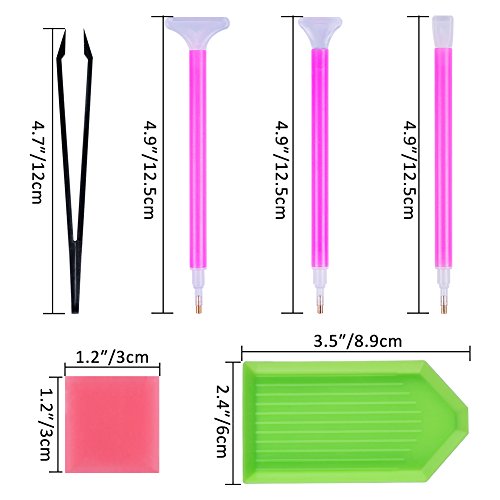 - Tools measurement: diamond stitch pen's length: about 12.5 cm/ 4.9 inch; Plastic tray size (L x W): 8.9 x 6.0 cm/ 3.5 x 2.4 inch; Tweezers length: 12 cm/ 4.7 inch; Clay size(L x W): 3 x 3 cm/ 1.2 x 1.2 inch.