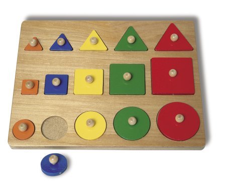 Studio : TAG Toys Publisher : TAG Toys Binding : Toy Product Description Fifteen shapes arranged in order by color and size. The knobs in this puzzle will not come out since they are glued and doweled from the side. Shapes are in bright primary colors and are raised above the surface of the puzzle board to emphasize the identity of the shape. 0